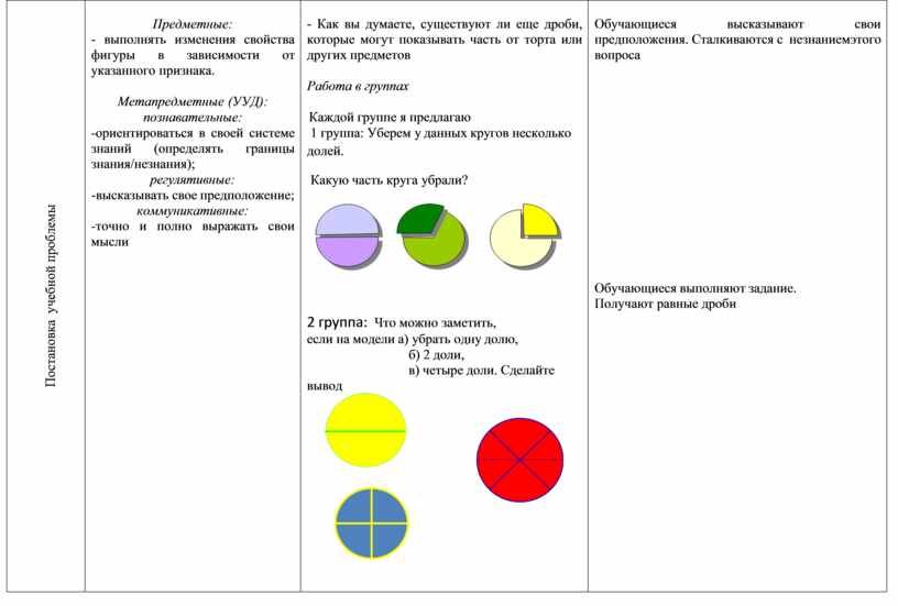 2 группа: Что можно заметить, если на модели а) убрать одну долю, б) 2 доли, в) четыре доли. Сделайте вывод