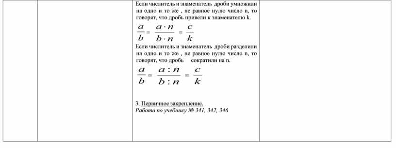 Если числитель и знаменатель дроби умножили на одно и то же , не равное нулю число n, то говорят, что дробь привели к знаменателю k.