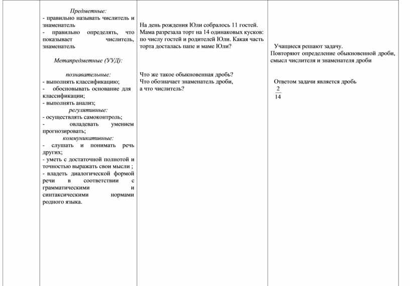 Предметные: - знать отличительные особенности числителя и знаменателя - владеть разными способами записи дроби |