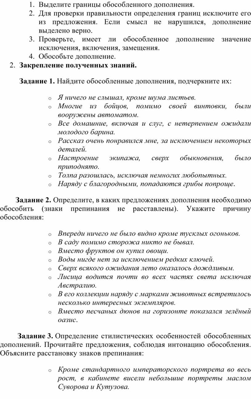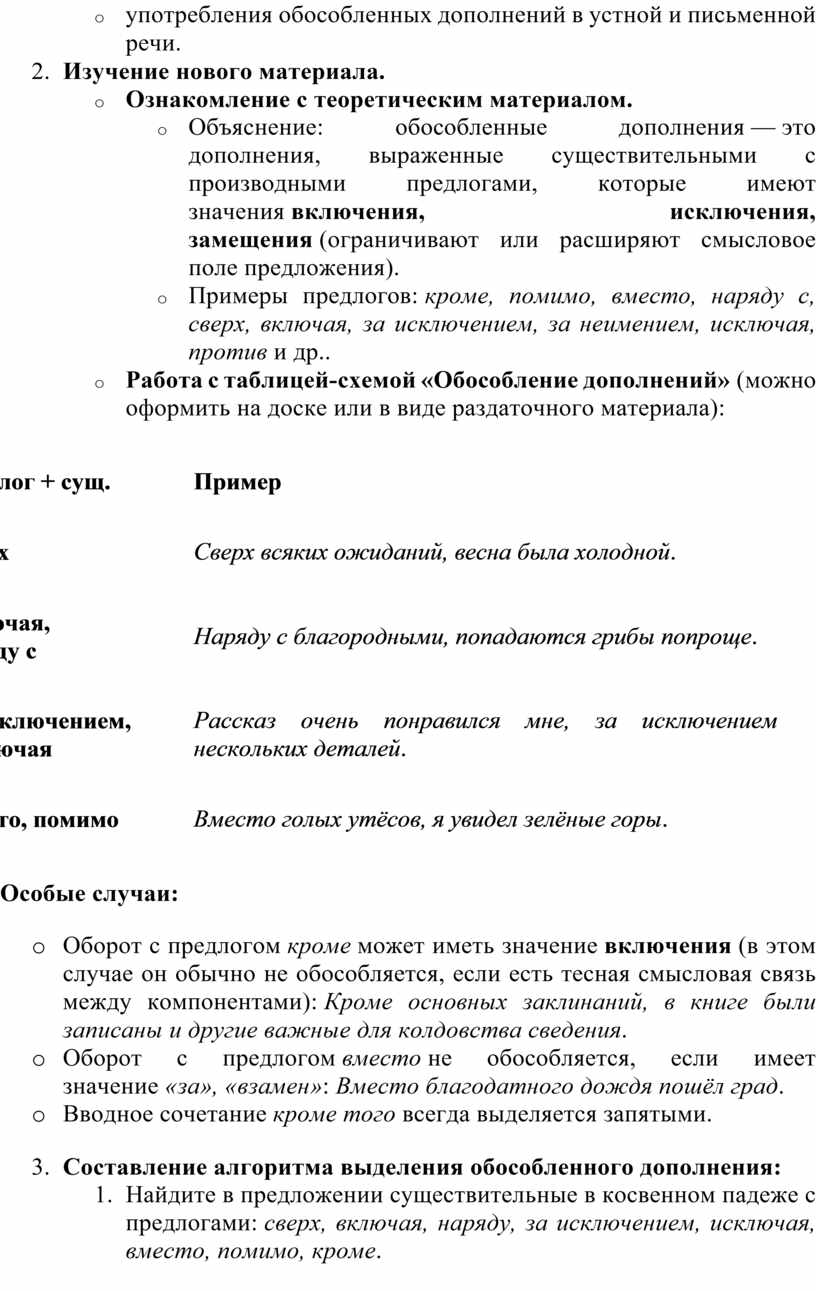 o Объяснение: обособленные дополнения — это дополнения, выраженные существительными с производными предлогами, которые имеют значения включения, исключения, замещения (ограничивают или расширяют смысловое поле предложения).