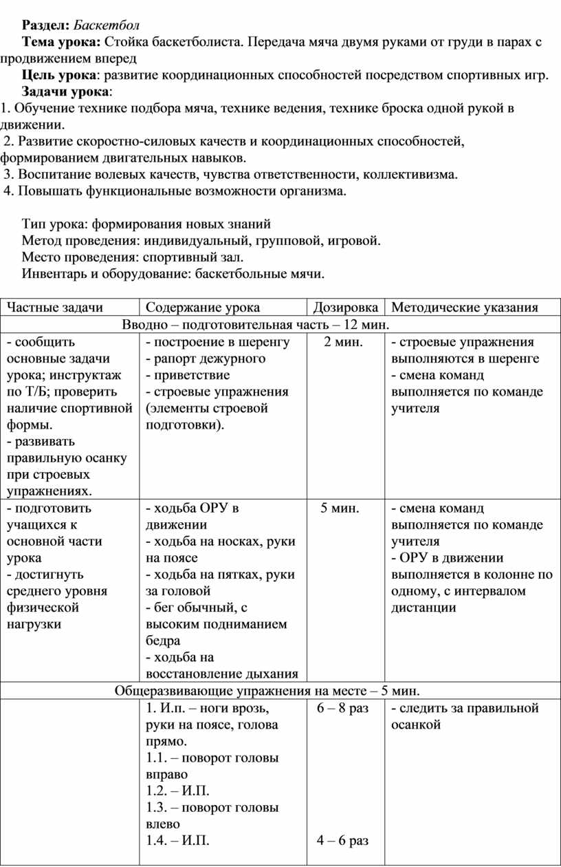 Тема урока: Стойка баскетболиста. Передача мяча двумя руками от груди в парах с продвижением вперед
