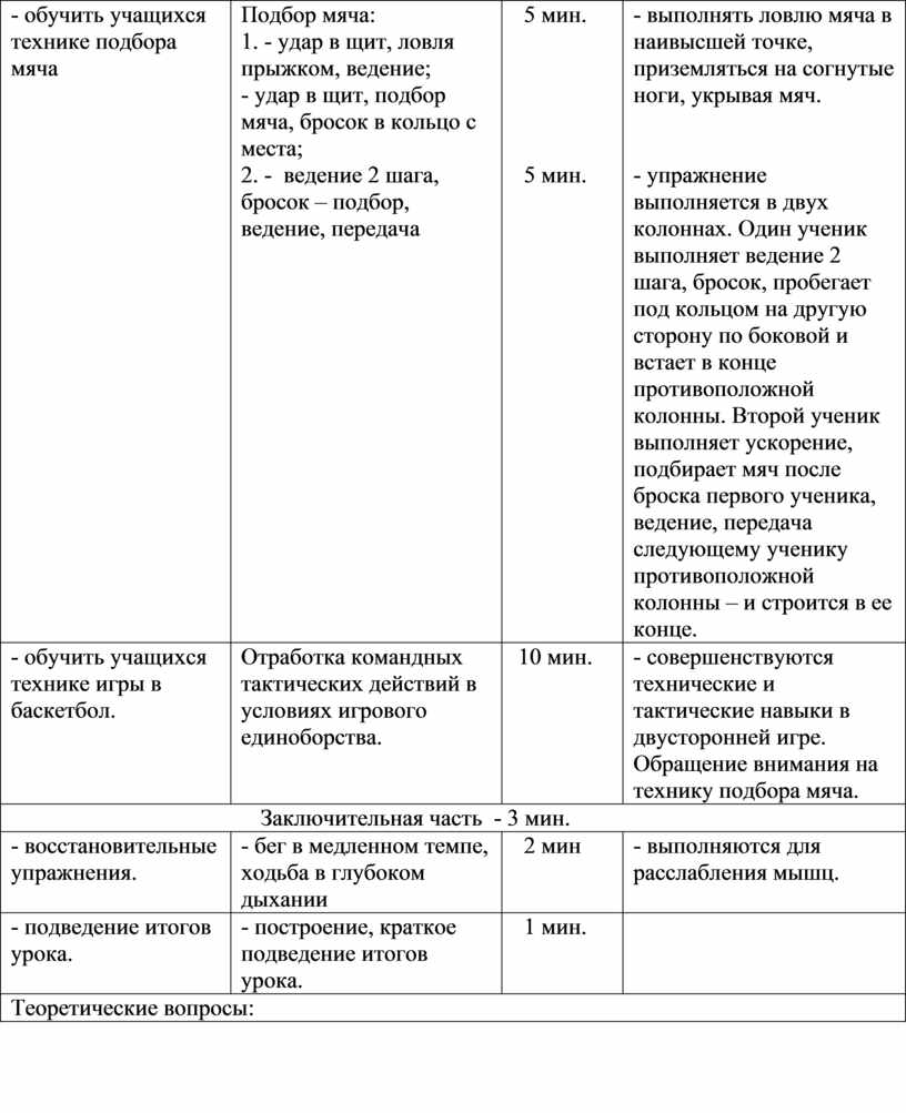 Подбор мяча: 1. - удар в щит, ловля прыжком, ведение; - удар в щит, подбор мяча, бросок в кольцо с места; 2. - ведение 2 шага, бросок – подбор, ведение, передача |