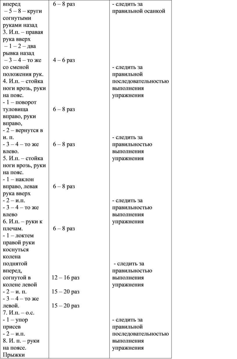 1. И.п. – ноги врозь, руки на поясе, голова прямо. 1.1. – поворот головы вправо 1.2. – И.П. 1.3. – поворот головы влево 1.4. – И.П. 2. И.п. – руки согнуты к плечам – 1 – 4 – круги согнутыми руками вперед – 5 – 8 – круги согнутыми руками назад 3. И.п. – правая рука вверх – 1 – 2 – два рывка назад – 3 – 4 – то же со сменой положения рук. 4. И.п. – стойка ноги врозь, руки на пояс. - 1 – поворот туловища вправо, руки вправо, - 2 – вернутся в и. п. - 3 – 4 – то же влево. 5. И.п. – стойка ноги врозь, руки на пояс. - 1 – наклон вправо, левая рука вверх - 2 – и.п. - 3 – 4 – то же влево 6. И.п. – руки к плечам. - 1 – локтем правой руки коснуться колена поднятой вперед, согнутой в колене левой - 2 – и. п. - 3 – 4 – то же левой. 7. И.п. – о.с. - 1 – упор присев - 2 – и.п. 8. И. п. – руки на поясе. Прыжки толчком двух ног. 9. И.п. – руки на поясе. - 1 – 4 – прыжки на правой ноге - 5 – 8 – то же на левой |