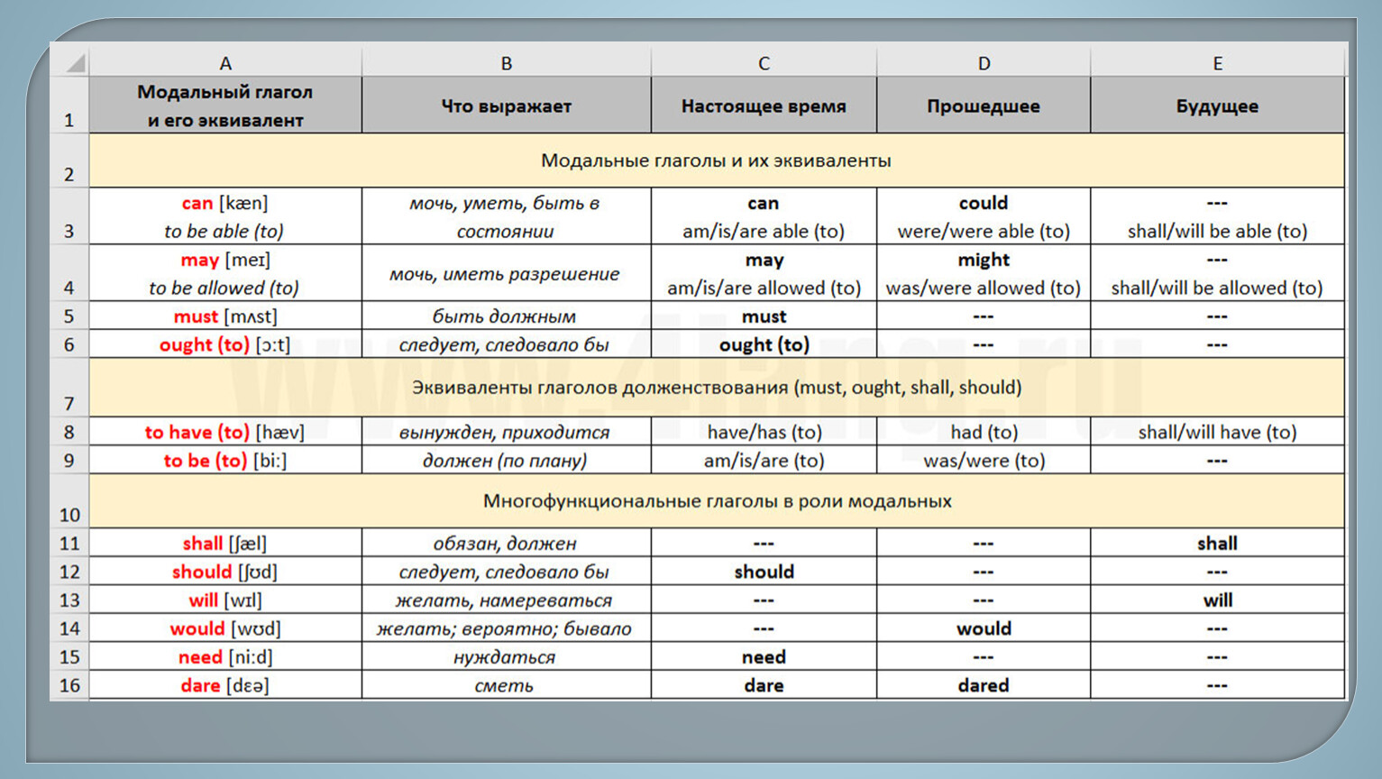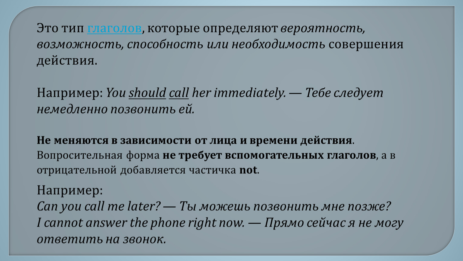 Это тип глаголов, которые определяют вероятность, возможность, способность или необходимость совершения действия.