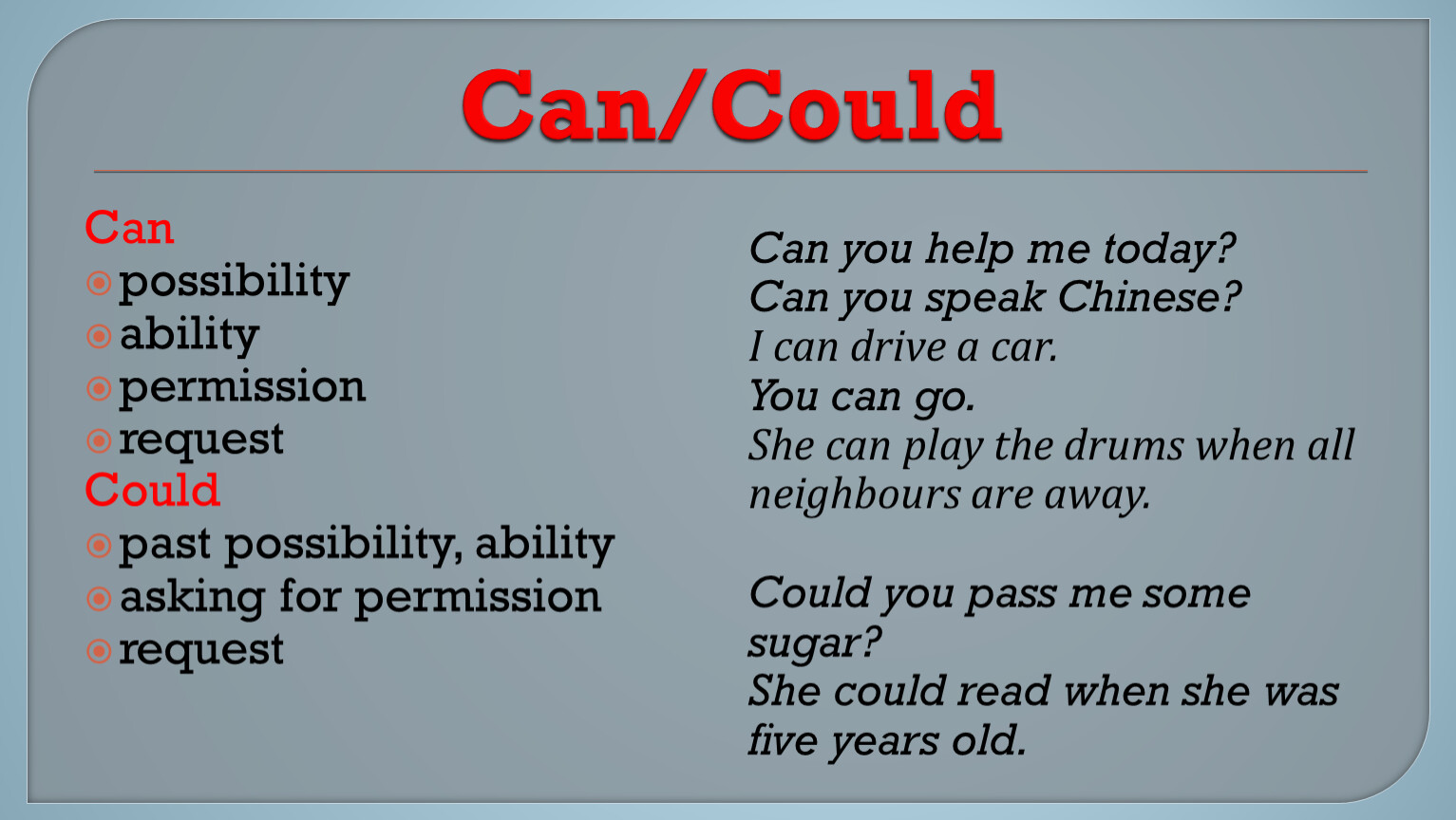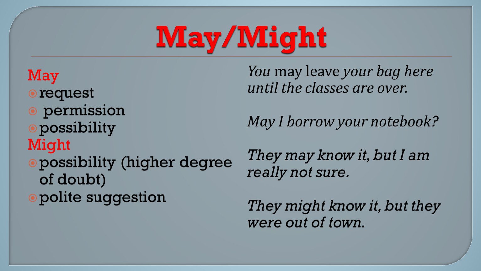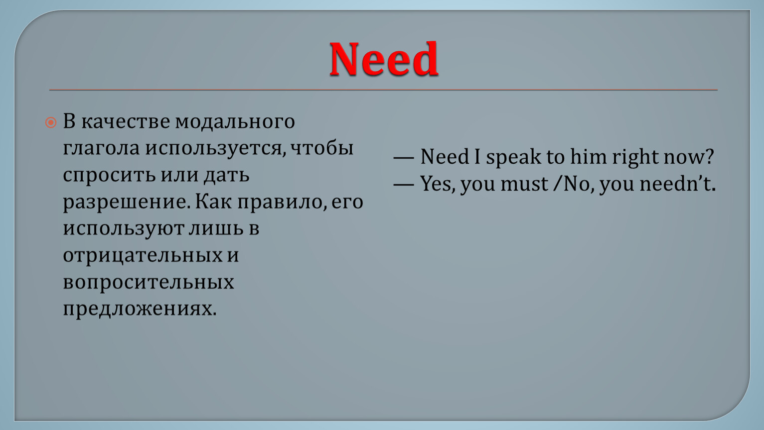 В качестве модального глагола используется, чтобы спросить или дать разрешение. Как правило, его используют лишь в отрицательных и вопросительных предложениях.