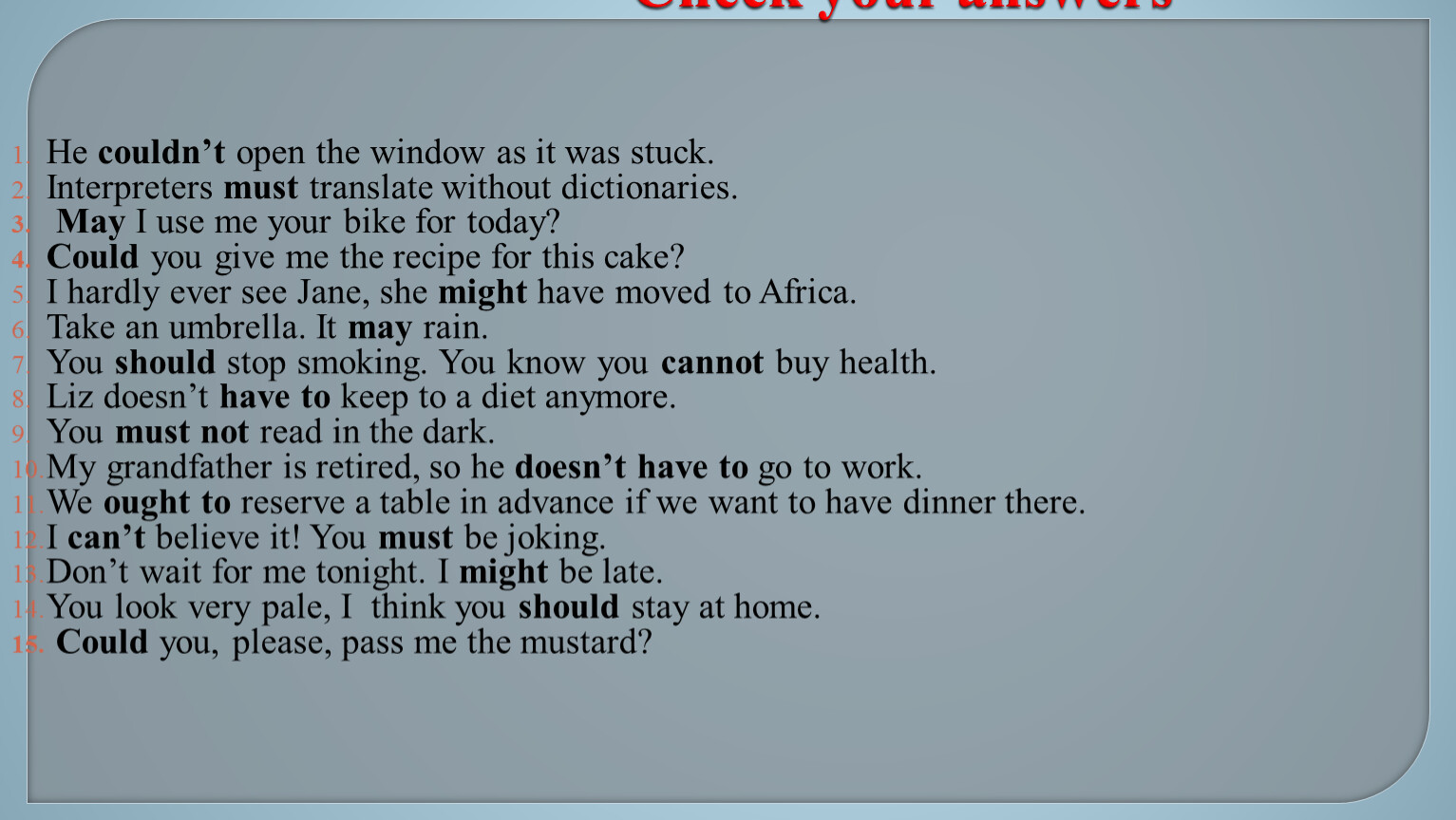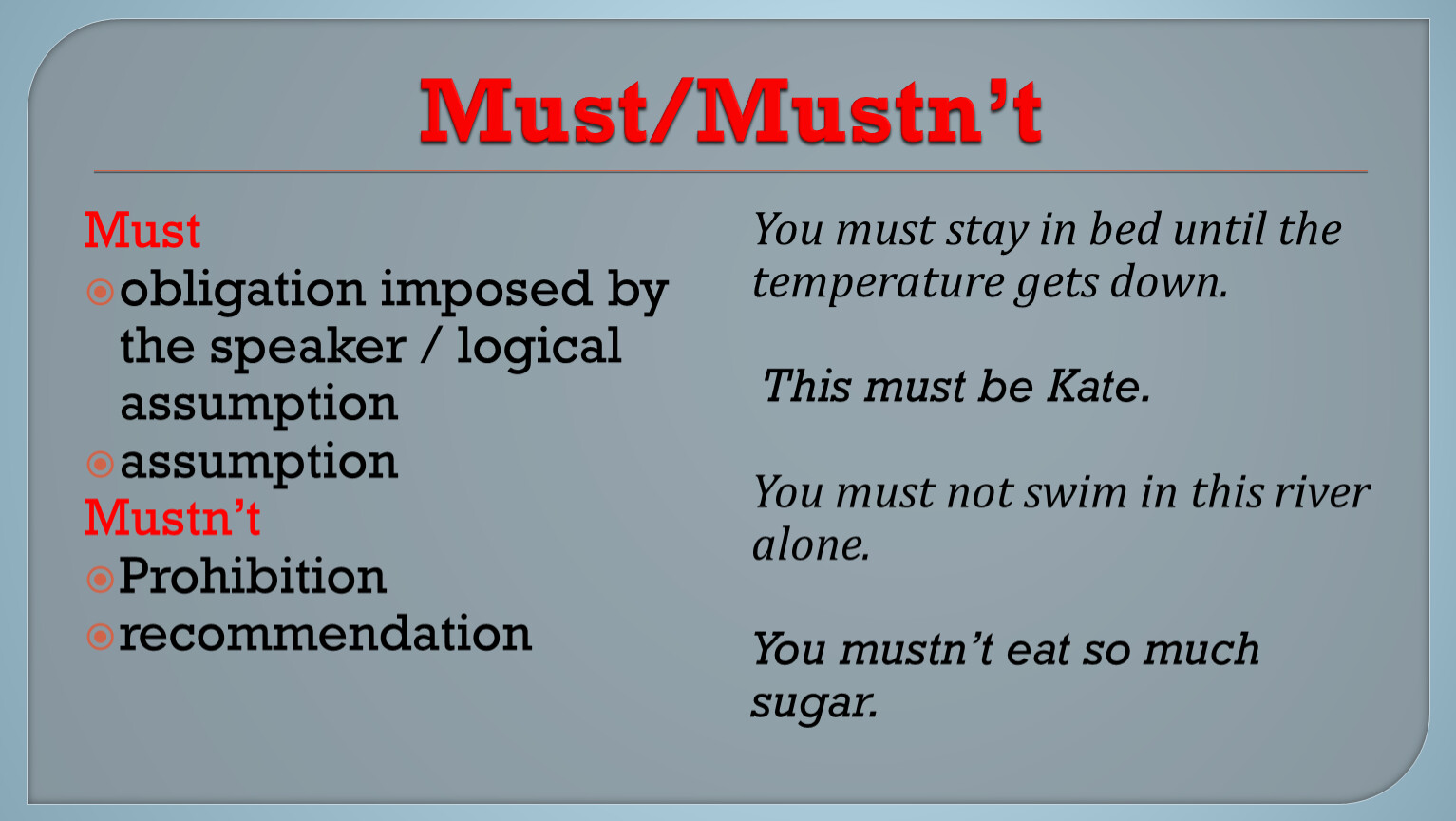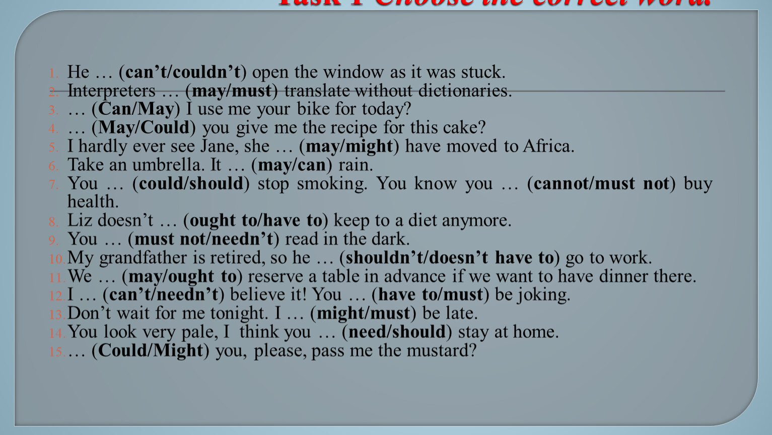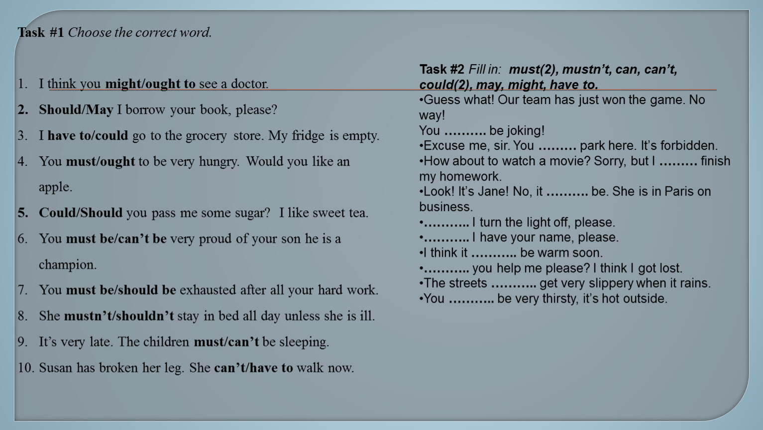 Task #2 Fill in: must(2), mustn’t, can, can’t, could(2), may, might, have to.
