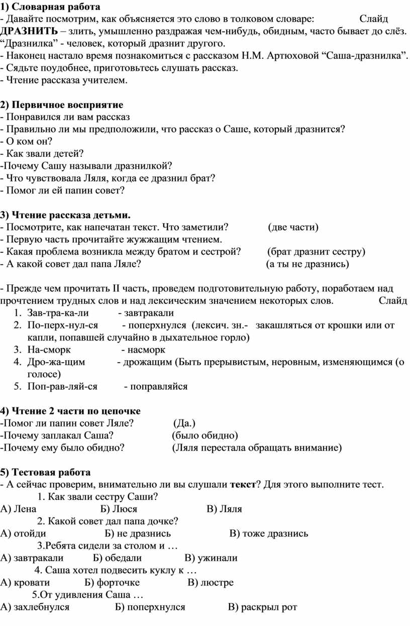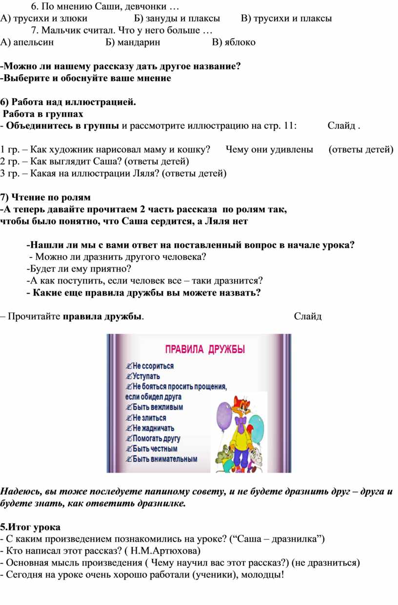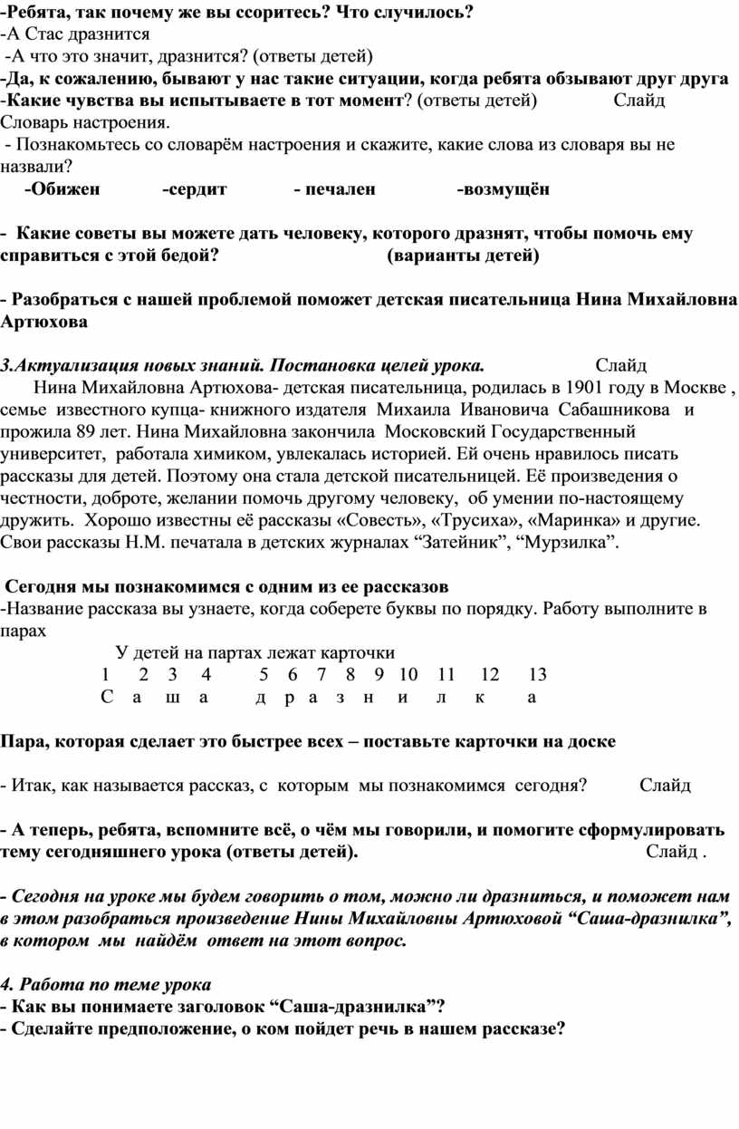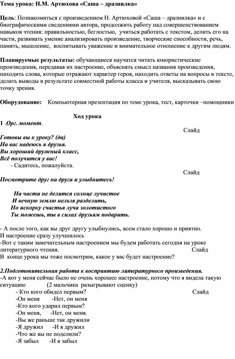 Цель: Познакомиться с произведением Н. Артюховой «Саша – дразнилка» и с биографическими сведениями автора, продолжить работу над совершенствованием навыков чтения: правильностью, беглостью, учиться работать с текстом, делить его на части, развивать умение анализировать произведение, творческие способности, речь, память, мышление, воспитывать уважение и внимательное отношение к другим людям.