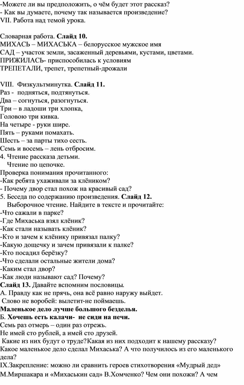 IX.Закрепление: можно ли сравнить героев стихотворения «Мудрый дед» М.Миршакара и «Михаськин сад» В.Хомченко? Чем они похожи? А чем отличаются? (возраст) А чем вы можете помочь или может уже помогали своему двору, селу, школе? Слайд 14.