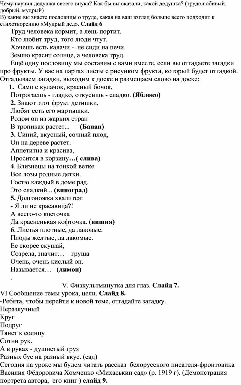 В) какие вы знаете пословицы о труде, какая на ваш взгляд больше всего подходит к стихотворению «Мудрый дед». Слайд 6