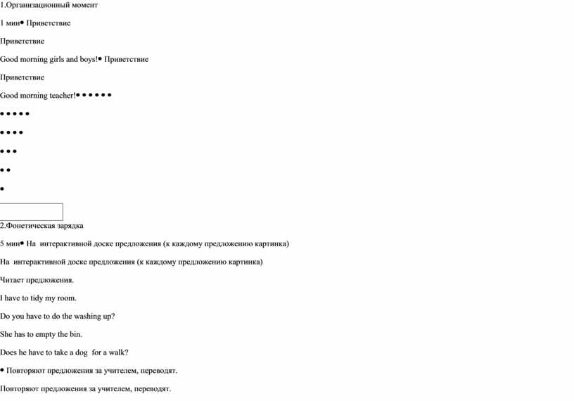 На интерактивной доске предложения (к каждому предложению картинка) Читает предложения. I have to tidy my room. Do you have to do the washing up? She has to empty the bin. Does he have to take a dog for a walk?