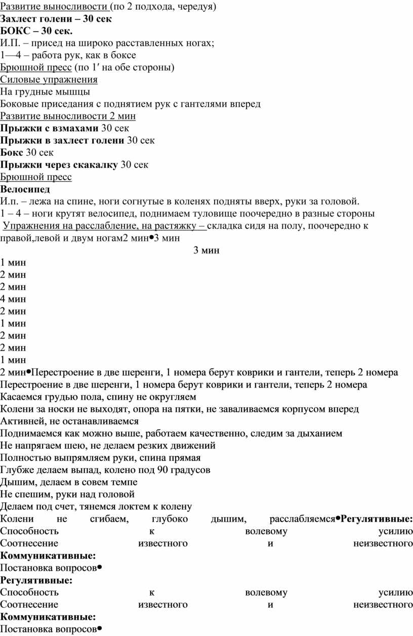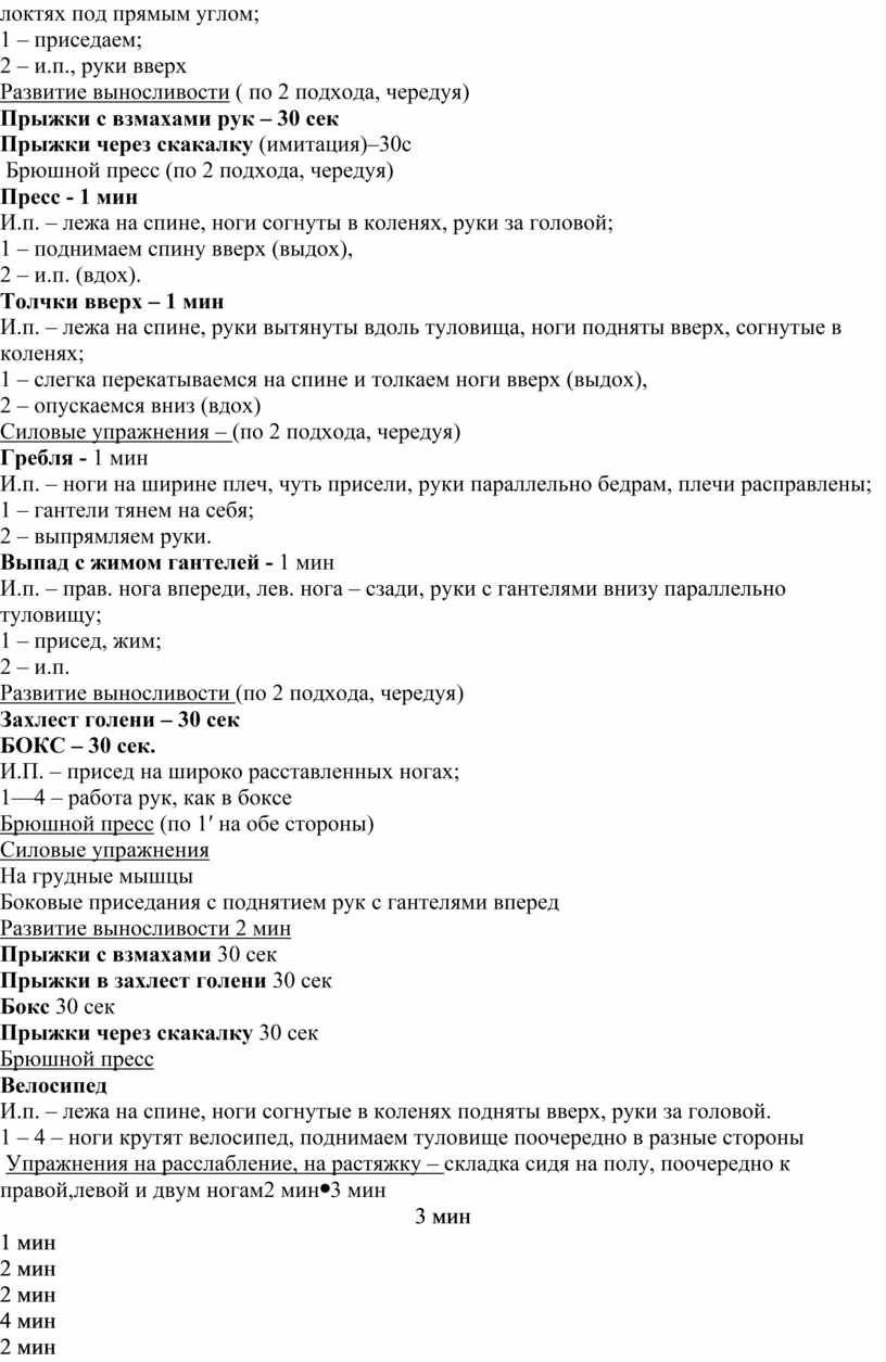 Силовые упражнения (по 2 подхода, чередуя) Отжимания (30 сек) - на коленях ; - на носках. Приседания и жимы с гантелями И.п. – ноги чуть шире плеч, руки согнуты в локтях под прямым углом; 1 – приседаем; 2 – и.п., руки вверх Развитие выносливости ( по 2 подхода, чередуя) Прыжки с взмахами рук – 30 сек Прыжки через скакалку (имитация)–30с Брюшной пресс (по 2 подхода, чередуя) Пресс - 1 мин И.п. – лежа на спине, ноги согнуты в коленях, руки за головой; 1 – поднимаем спину вверх (выдох), 2 – и.п. (вдох). Толчки вверх – 1 мин И.п. – лежа на спине, руки вытянуты вдоль туловища, ноги подняты вверх, согнутые в коленях; 1 – слегка перекатываемся на спине и толкаем ноги вверх (выдох), 2 – опускаемся вниз (вдох) Силовые упражнения – (по 2 подхода, чередуя) Гребля - 1 мин И.п. – ноги на ширине плеч, чуть присели, руки параллельно бедрам, плечи расправлены; 1 – гантели тянем на себя; 2 – выпрямляем руки. Выпад с жимом гантелей - 1 мин И.п. – прав. нога впереди, лев. нога – сзади, руки с гантелями внизу параллельно туловищу; 1 – присед, жим; 2 – и.п. Развитие выносливости (по 2 подхода, чередуя) Захлест голени – 30 сек БОКС – 30 сек. И.П. – присед на широко расставленных ногах; 1—4 – работа рук, как в боксе Брюшной пресс (по 1′ на обе стороны) Силовые упражнения На грудные мышцы Боковые приседания с поднятием рук с гантелями вперед Развитие выносливости 2 мин Прыжки с взмахами 30 сек Прыжки в захлест голени 30 сек Бокс 30 сек Прыжки через скакалку 30 сек Брюшной пресс Велосипед И.п. – лежа на спине, ноги согнутые в коленях подняты вверх, руки за головой. 1 – 4 – ноги крутят велосипед, поднимаем туловище поочередно в разные стороны Упражнения на расслабление, на растяжку – складка сидя на полу, поочередно к правой,левой и двум ногам2 мин |