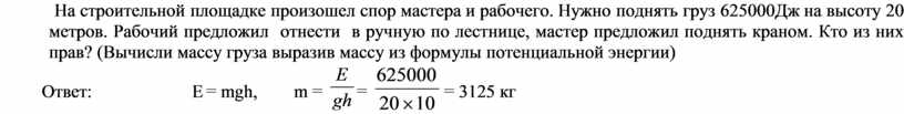 На строительной площадке произошел спор мастера и рабочего. Нужно поднять груз обладающий энергией 625000Дж на высоту 20 метров. Рабочий предложил отнести в ручную по лестнице, мастер предложил поднять краном. Кто из них прав? (Вычисли массу груза, выразив массу из формулы потенциальной энергии)
