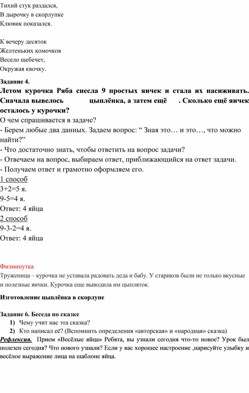 Летом курочка Ряба снесла 9 простых яичек и стала их насиживать. Сначала вывелось цыплёнка, а затем ещё . Сколько ещё яичек осталось у курочки?