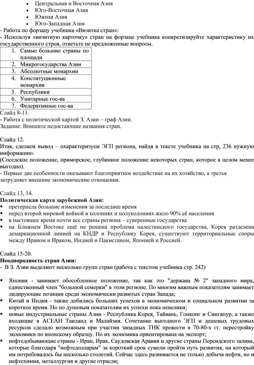 - В З. Азии выделяют несколько групп стран (работа с текстом учебника стр. 242)