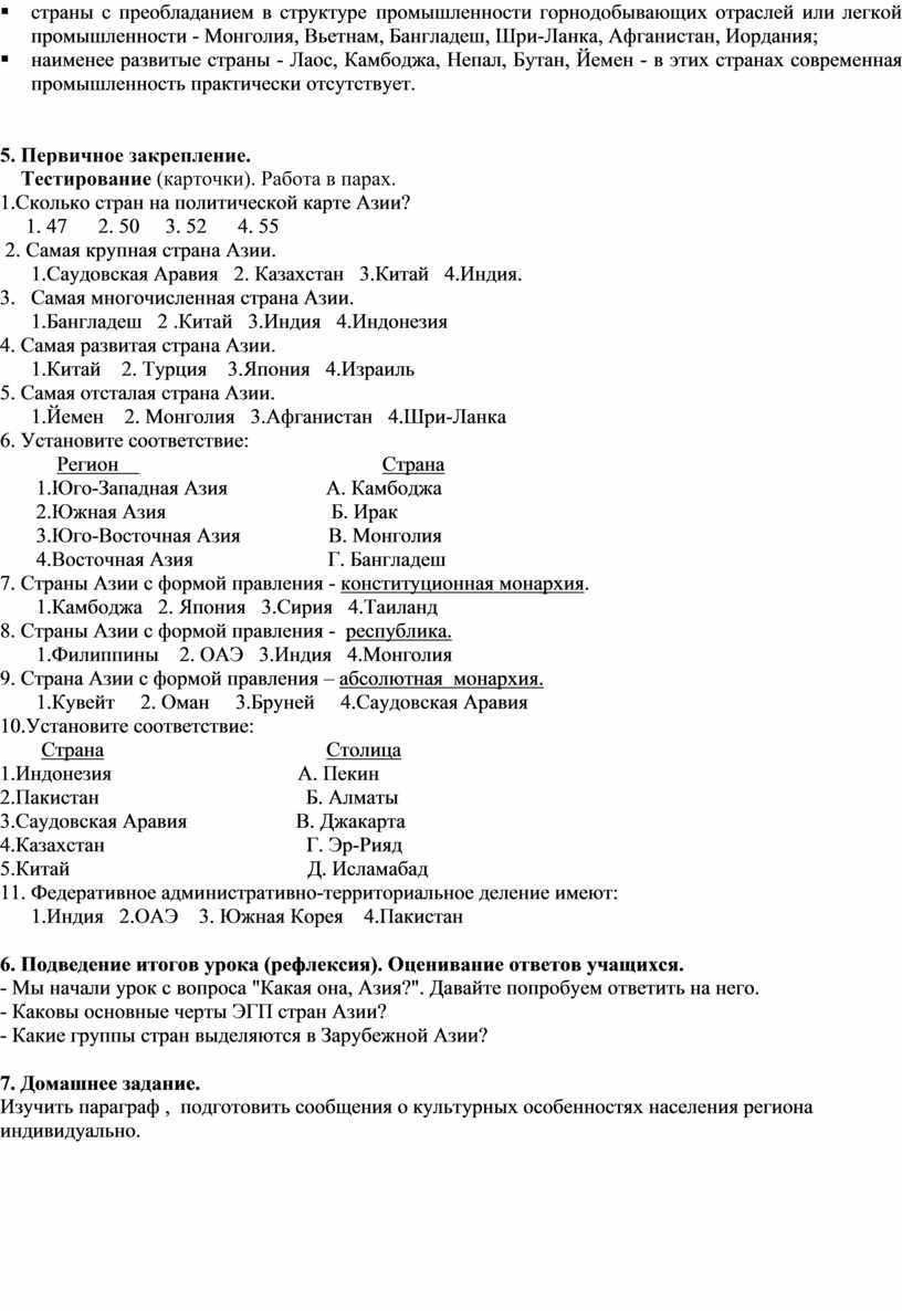 1. формирование представлений о политической карте и своеобразии азиатского региона;
