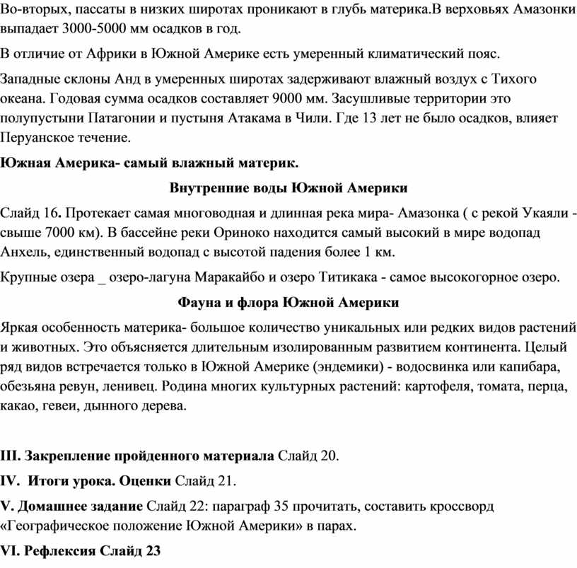 V. Домашнее задание Слайд 22: параграф 35 прочитать, составить кроссворд «Географическое положение Южной Америки» в парах.