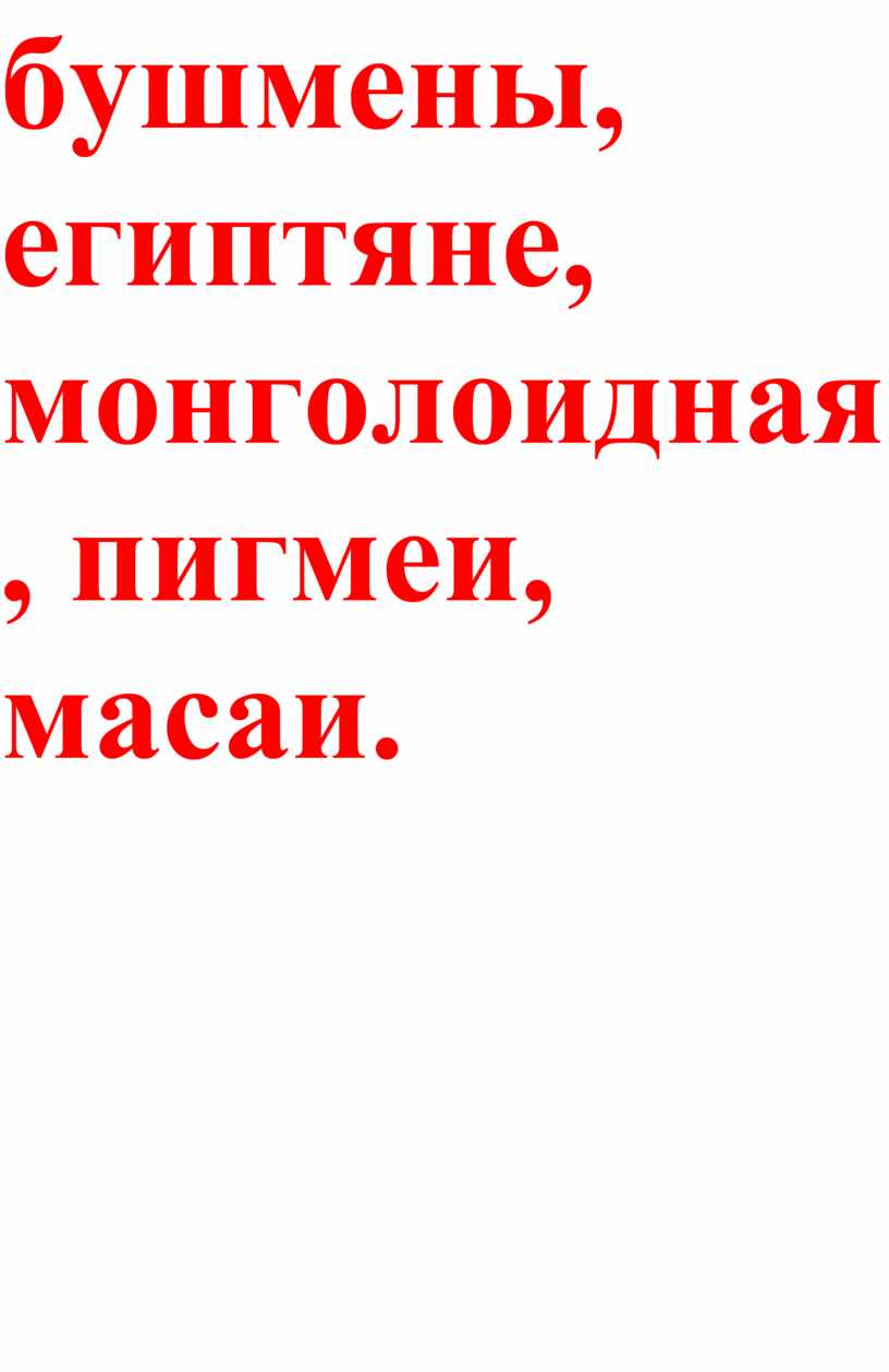 бушмены, египтяне, монголоидная, пигмеи, масаи.