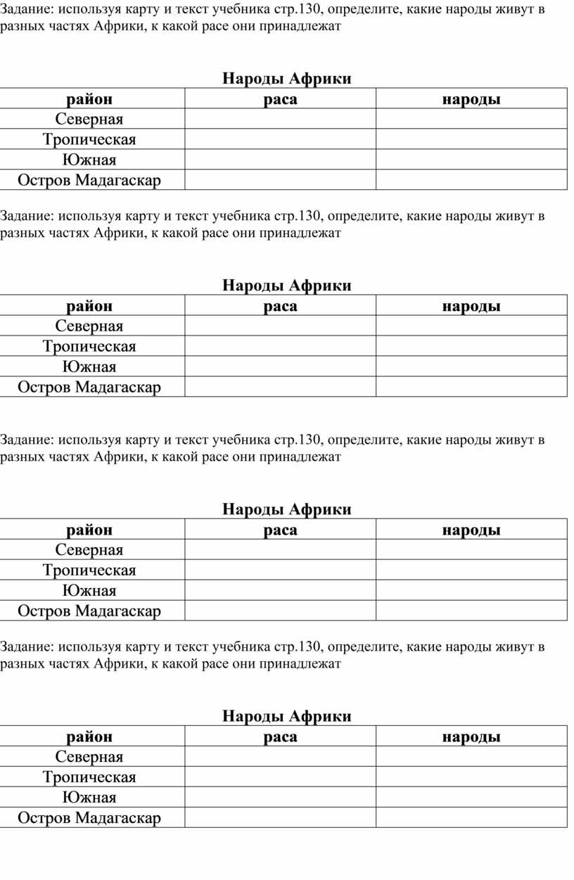 Задание: используя карту и текст учебника стр.130, определите, какие народы живут в разных частях Африки, к какой расе они принадлежат