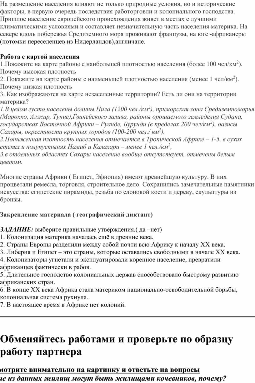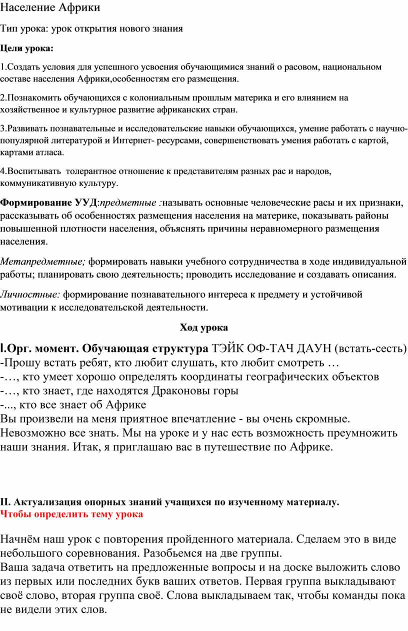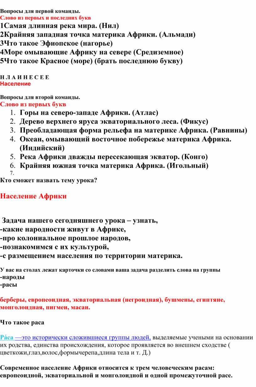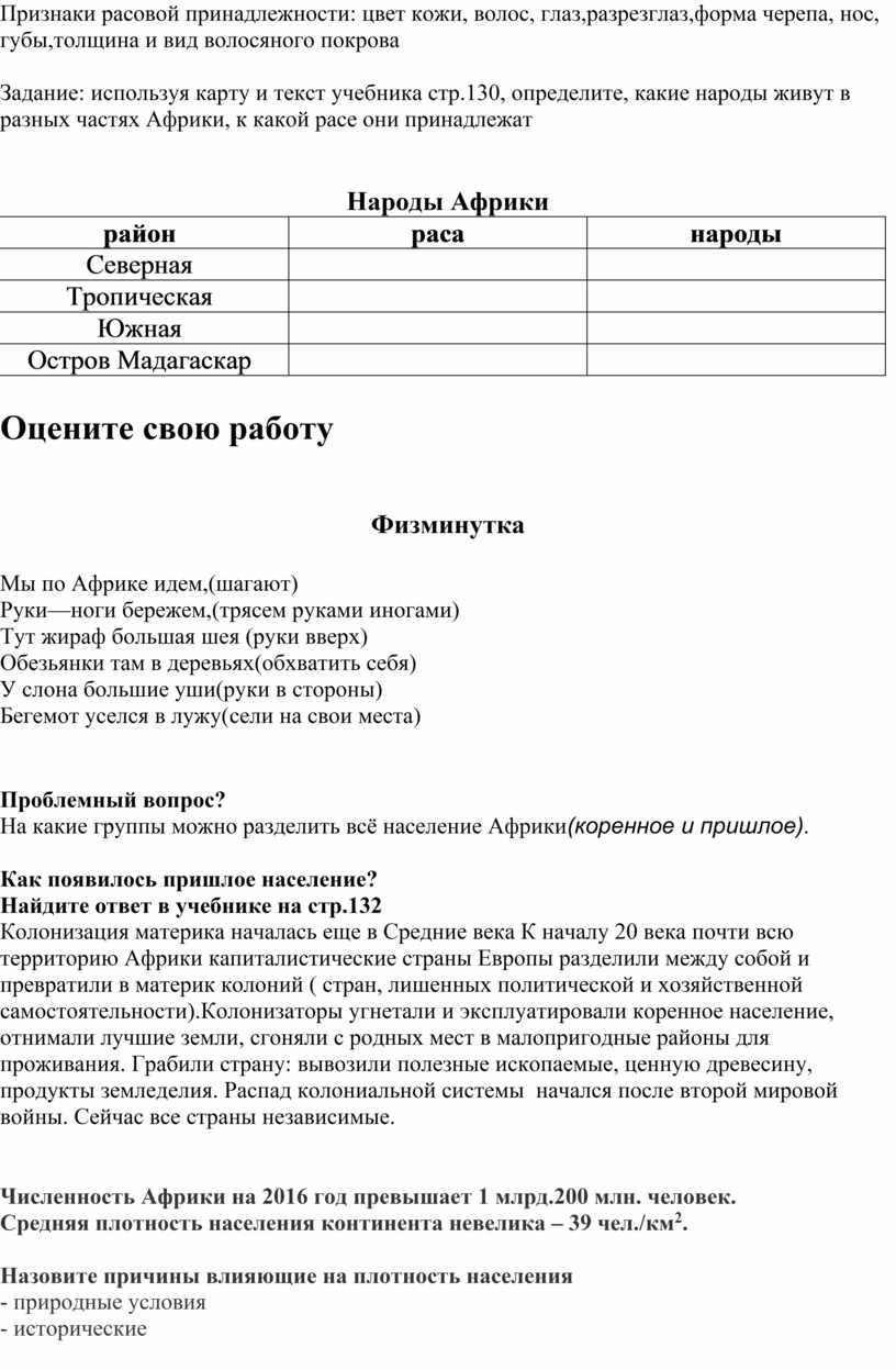 1.Создать условия для успешного усвоения обучающимися знаний о расовом, национальном составе населения Африки,особенностям его размещения.