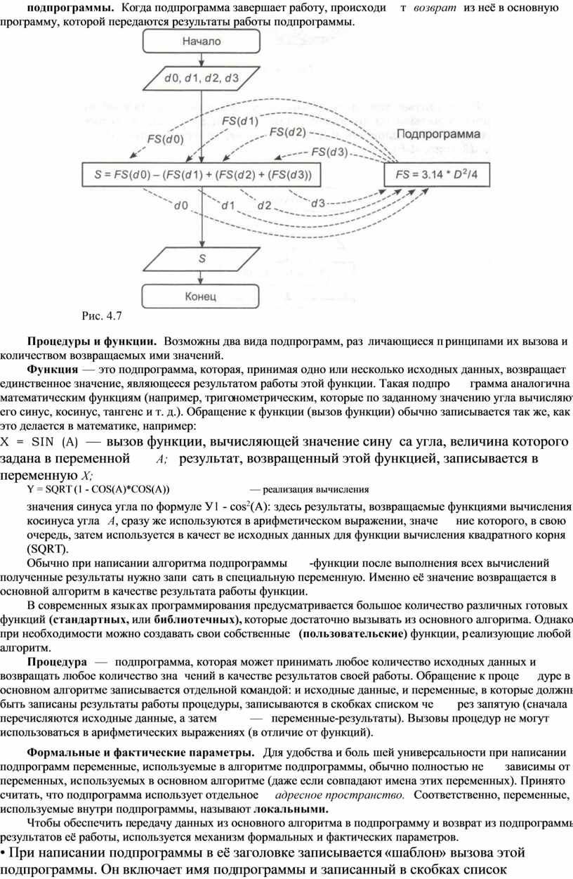 Существует возможность упростить такой алгоритм, вынеся из него однотипные действия в отдельный, подчинённый алгоритм и обращаясь к подчинённому алгоритму из основного (главного) алгоритма с требуемыми исходными данными (рис. 4.7). Такой подчинённый алгоритм реализуется в виде подпрограммы. Когда подпрограмма завершает работу, происходит возврат из неё в основную программу, которой передаются результаты работы подпрограммы.