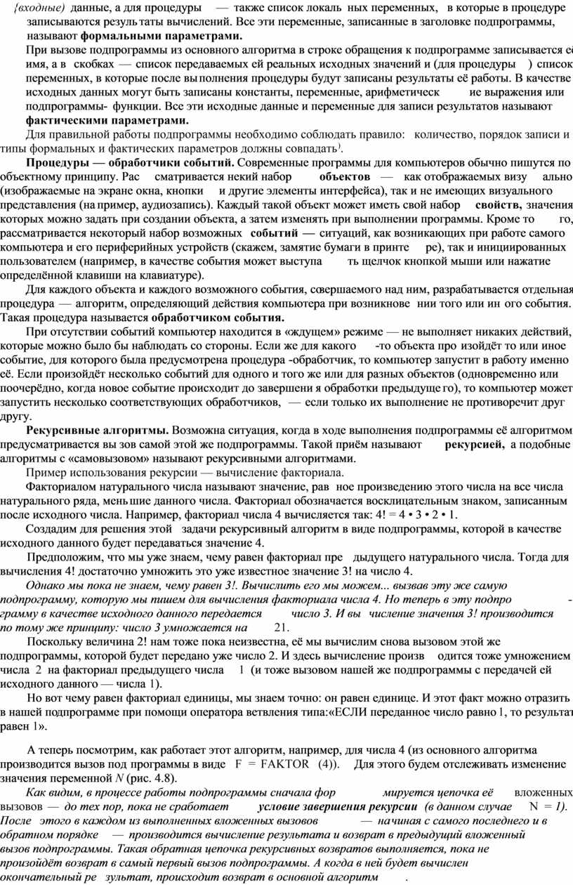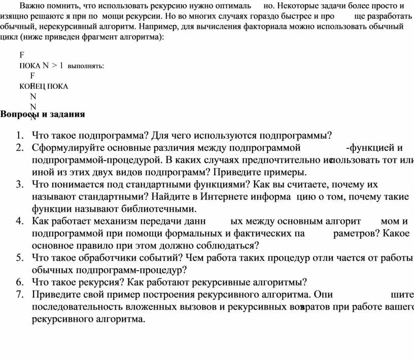 Рекурсивные алгоритмы. Возможна ситуация, когда в ходе выполнения подпрограммы её алгоритмом предусматривается вызов самой этой же подпрограммы. Такой приём называют рекурсией, а подобные алгоритмы с «самовызовом» называют рекурсивными алгоритмами.