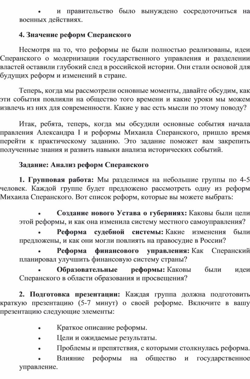 3. Презентация и обсуждение: После того как все группы подготовят свои презентации, мы проведем общее обсуждение. Каждая группа представит свою работу, а затем мы обсудим, как реформы Сперанского соотносятся друг с другом и как они повлияли на дальнейшее развитие России.