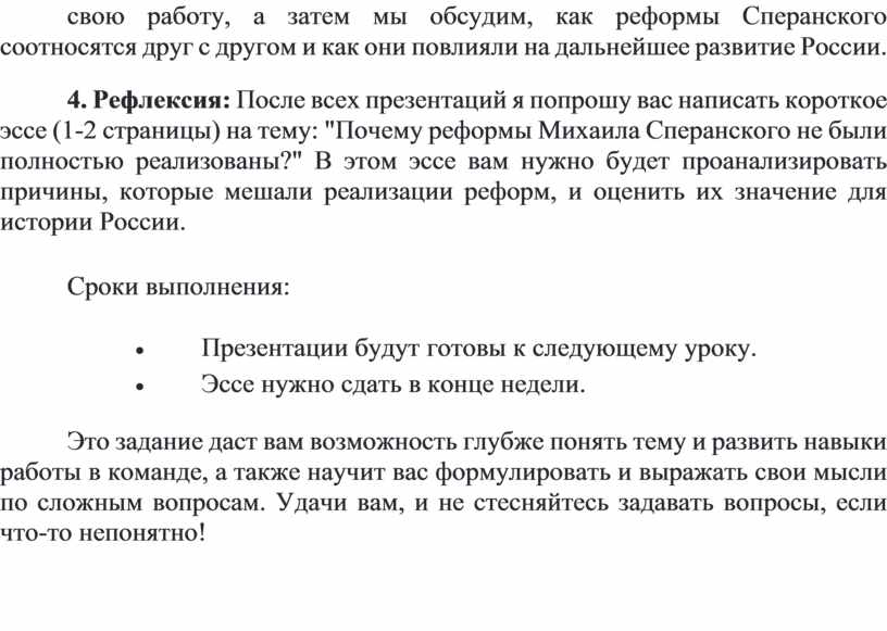 4. Рефлексия: После всех презентаций я попрошу вас написать короткое эссе (1-2 страницы) на тему: "Почему реформы Михаила Сперанского не были полностью реализованы?" В этом эссе вам нужно будет проанализировать причины, которые мешали реализации реформ, и оценить их значение для истории России.