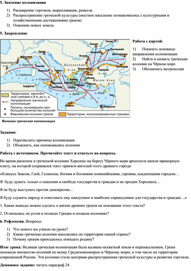 Итог урока: Великая греческая колонизация была вызвана нехваткой земли и перенаселением. Греки основали множество колоний по всему Средиземноморью и Чёрному морю, в том числе на территории современной России. Эти колонии стали центрами распространения греческой культуры и развития торговли.
