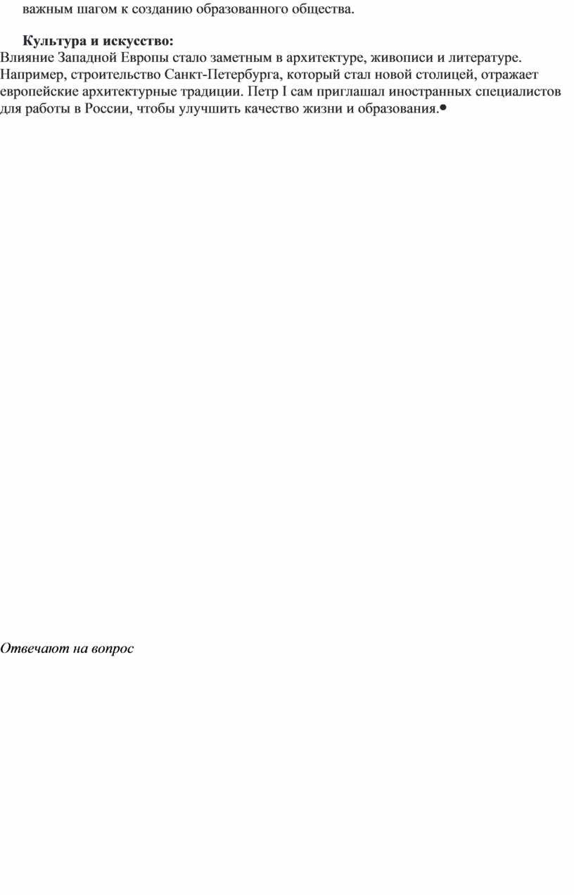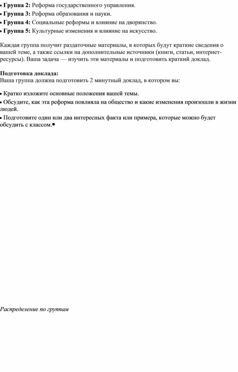 Теперь, когда мы обсудили основные изменения, произошедшие в России в эпоху Петра I, давайте перейдем к практическому заданию. Это поможет вам лучше усвоить материал и применить полученные знания на практике. 😊 Задание: Исследование реформ Петра IЦели задания: · Узнать больше о конкретных реформах Петра I. · Научиться работать с историческими источниками. · Развить навыки командной работы и презентации. Я разделю вас на небольшие группы по 4-5 человек. Каждая группа будет работать над определенной темой, связанной с реформами Петра I 1. Темы для групп: · Группа 1: Реформа армии и флота. · Группа 2: Реформа государственного управления. · Группа 3: Реформа образования и науки. · Группа 4: Социальные реформы и влияние на дворянство. · Группа 5: Культурные изменения и влияние на искусство. Каждая группа получит раздаточные материалы, в которых будут краткие сведения о вашей теме, а также ссылки на дополнительные источники (книги, статьи, интернет-ресурсы). Ваша задача — изучить эти материалы и подготовить краткий доклад. Подготовка доклада: · Кратко изложите основные положения вашей темы. · Обсудите, как эта реформа повлияла на общество и какие изменения произошли в жизни людей. · Подготовите один или два интересных факта или примера, которые можно будет обсудить с классом. |