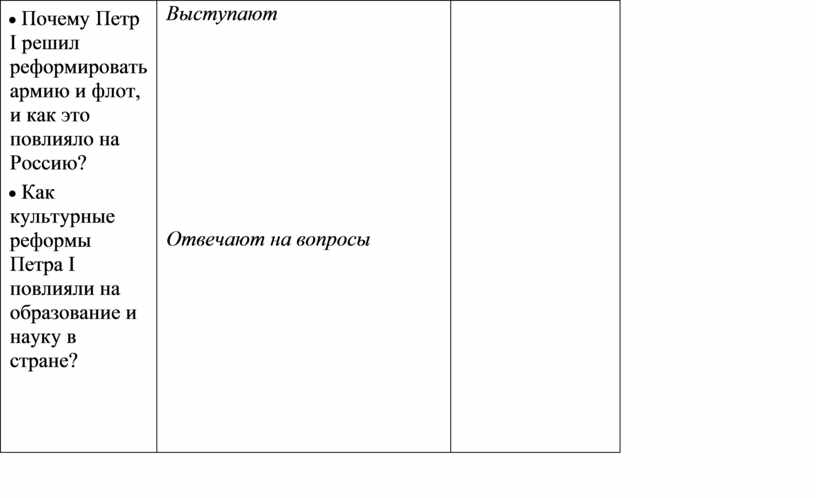 Я прошу каждую группу представить свои выводы. Молодцы. Наше занятие подошло к концу. Ответьте на вопросы: · Как реформы Петра I изменили жизнь дворян и крестьян? · Почему Петр I решил реформировать армию и флот, и как это повлияло на Россию? · Как культурные реформы Петра I повлияли на образование и науку в стране? |