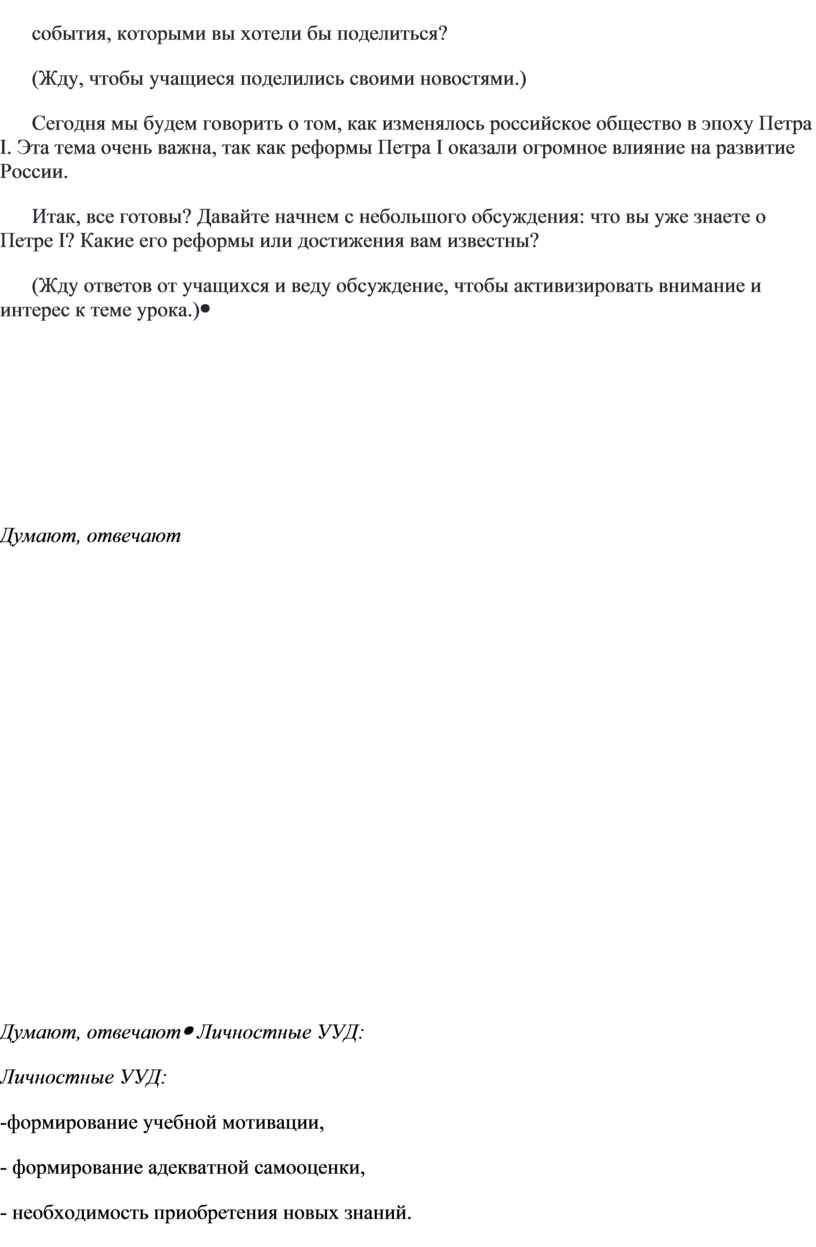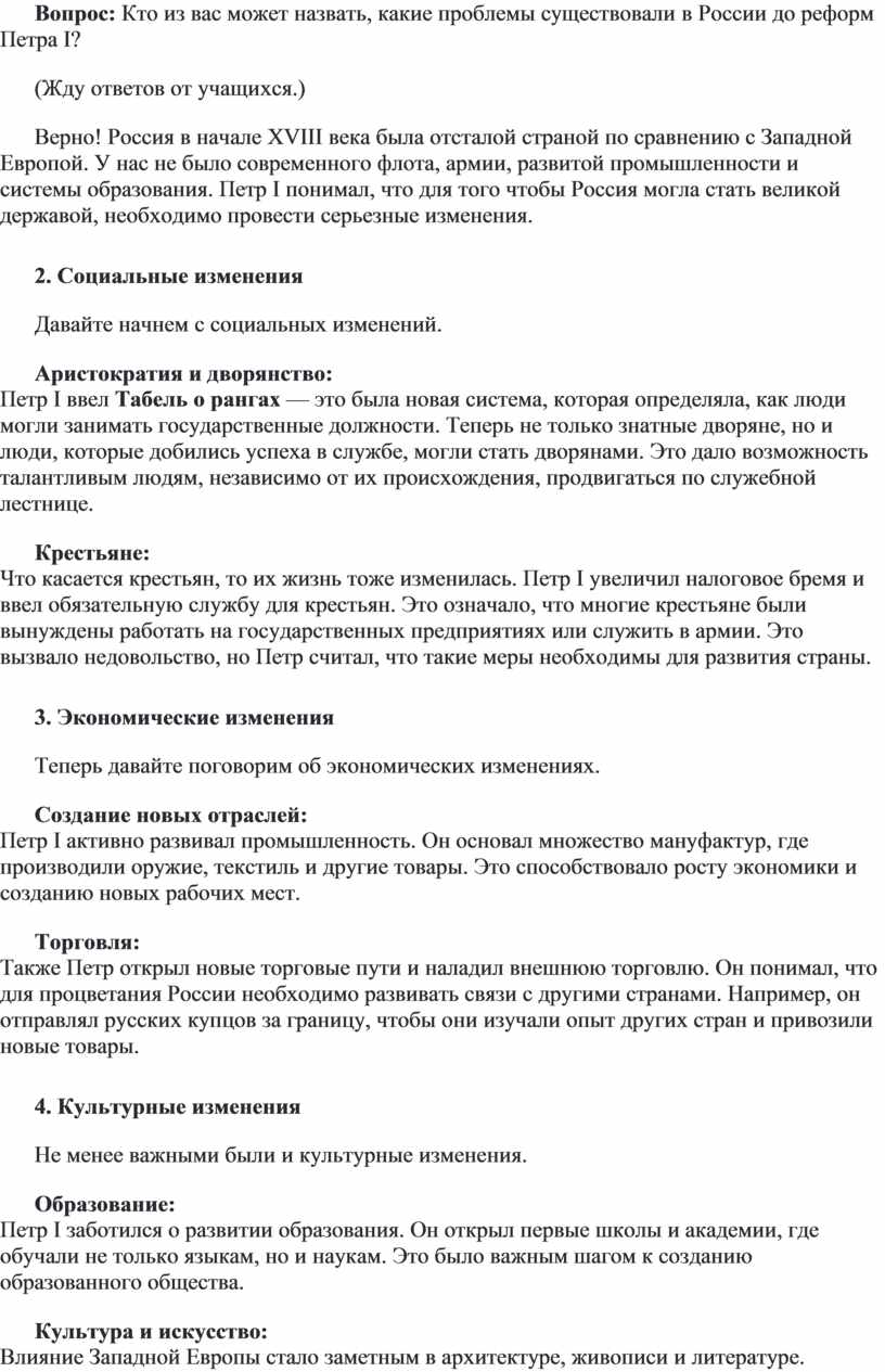 Здравствуйте, ребята. Как вы себя чувствуете сегодня? Есть ли у кого-то какие-то новости или события, которыми вы хотели бы поделиться? (Жду, чтобы учащиеся поделились своими новостями.) Сегодня мы будем говорить о том, как изменялось российское общество в эпоху Петра I. Эта тема очень важна, так как реформы Петра I оказали огромное влияние на развитие России. Итак, все готовы? Давайте начнем с небольшого обсуждения: что вы уже знаете о Петре I? Какие его реформы или достижения вам известны? (Жду ответов от учащихся и веду обсуждение, чтобы активизировать внимание и интерес к теме урока.) |