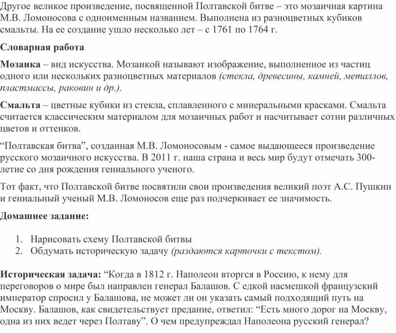 Впоследствии Петр I назвал битву при Лесной “матерью Полтавской баталии”. (После изучения сражения под Полтавой следует вернуться к высказыванию Петра I и попросить обучающихся объяснить его смысл/)
