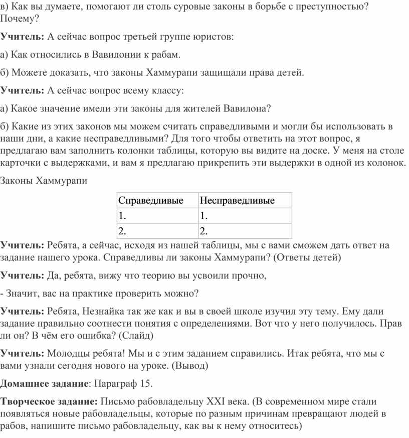 Учитель: Ребята, а сейчас, исходя из нашей таблицы, мы с вами сможем дать ответ на задание нашего урока. Справедливы ли законы Хаммурапи? (Ответы детей)