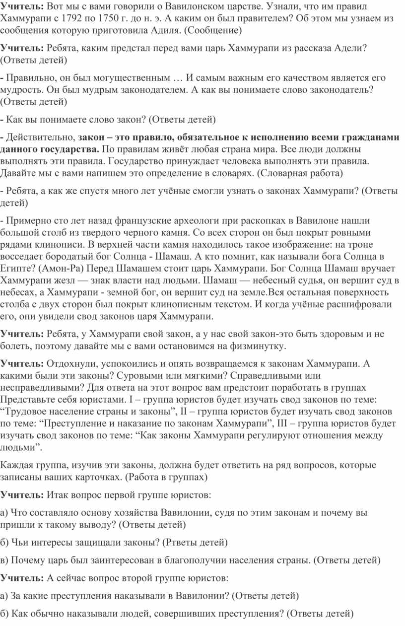 Учитель: Отдохнули, успокоились и опять возвращаемся к законам Хаммурапи. А какими были эти законы? Суровыми или мягкими? Справедливыми или несправедливыми? Для ответа на этот вопрос вам предстоит поработать в группах Представьте себя юристами. I – группа юристов будет изучать свод законов по теме: “Трудовое население страны и законы”, II – группа юристов будет изучать свод законов по теме: “Преступление и наказание по законам Хаммурапи”, III – группа юристов будет изучать свод законов по теме: “Как законы Хаммурапи регулируют отношения между людьми”.