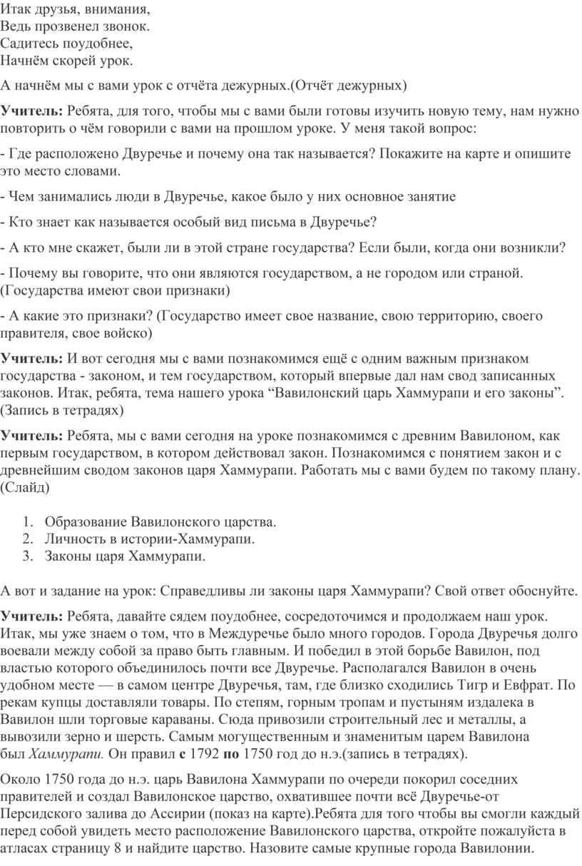 Учитель: И вот сегодня мы с вами познакомимся ещё с одним важным признаком государства - законом, и тем государством, который впервые дал нам свод записанных законов. Итак, ребята, тема нашего урока “Вавилонский царь Хаммурапи и его законы”. (Запись в тетрадях)