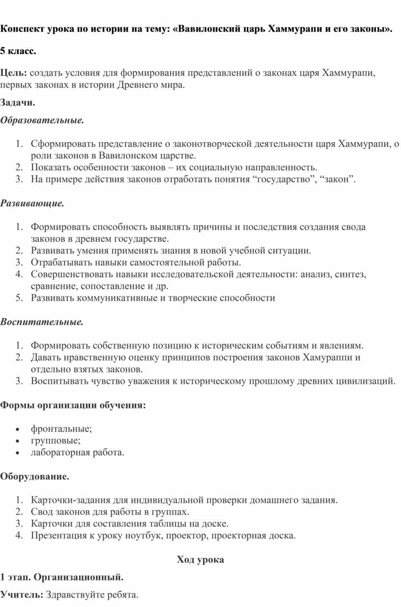 Цель: создать условия для формирования представлений о законах царя Хаммурапи, первых законах в истории Древнего мира.