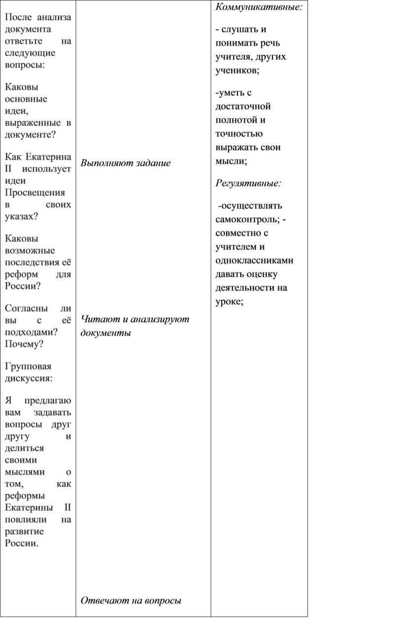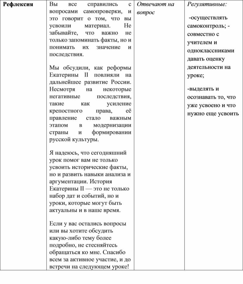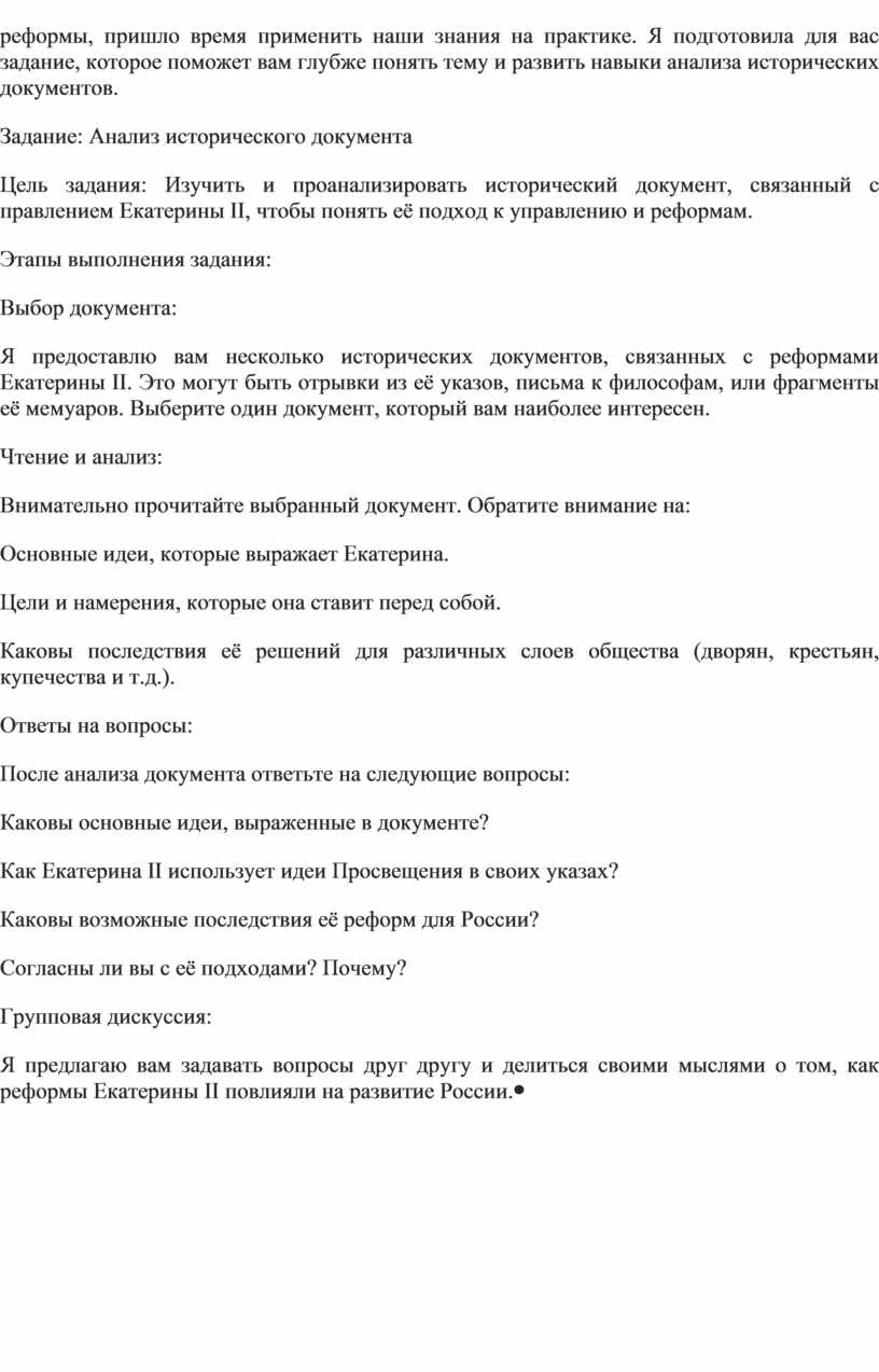 Итак, ребята, теперь, когда мы обсудили ключевые аспекты правления Екатерины II и её реформы, пришло время применить наши знания на практике. Я подготовила для вас задание, которое поможет вам глубже понять тему и развить навыки анализа исторических документов. Задание: Анализ исторического документа Цель задания: Изучить и проанализировать исторический документ, связанный с правлением Екатерины II, чтобы понять её подход к управлению и реформам. Этапы выполнения задания: Выбор документа: Я предоставлю вам несколько исторических документов, связанных с реформами Екатерины II. Это могут быть отрывки из её указов, письма к философам, или фрагменты её мемуаров. Выберите один документ, который вам наиболее интересен. Чтение и анализ: Внимательно прочитайте выбранный документ. Обратите внимание на: Основные идеи, которые выражает Екатерина. Цели и намерения, которые она ставит перед собой. Каковы последствия её решений для различных слоев общества (дворян, крестьян, купечества и т.д.). Ответы на вопросы: После анализа документа ответьте на следующие вопросы: Каковы основные идеи, выраженные в документе? Как Екатерина II использует идеи Просвещения в своих указах? Каковы возможные последствия её реформ для России? Согласны ли вы с её подходами? Почему? Групповая дискуссия: Я предлагаю вам задавать вопросы друг другу и делиться своими мыслями о том, как реформы Екатерины II повлияли на развитие России. |