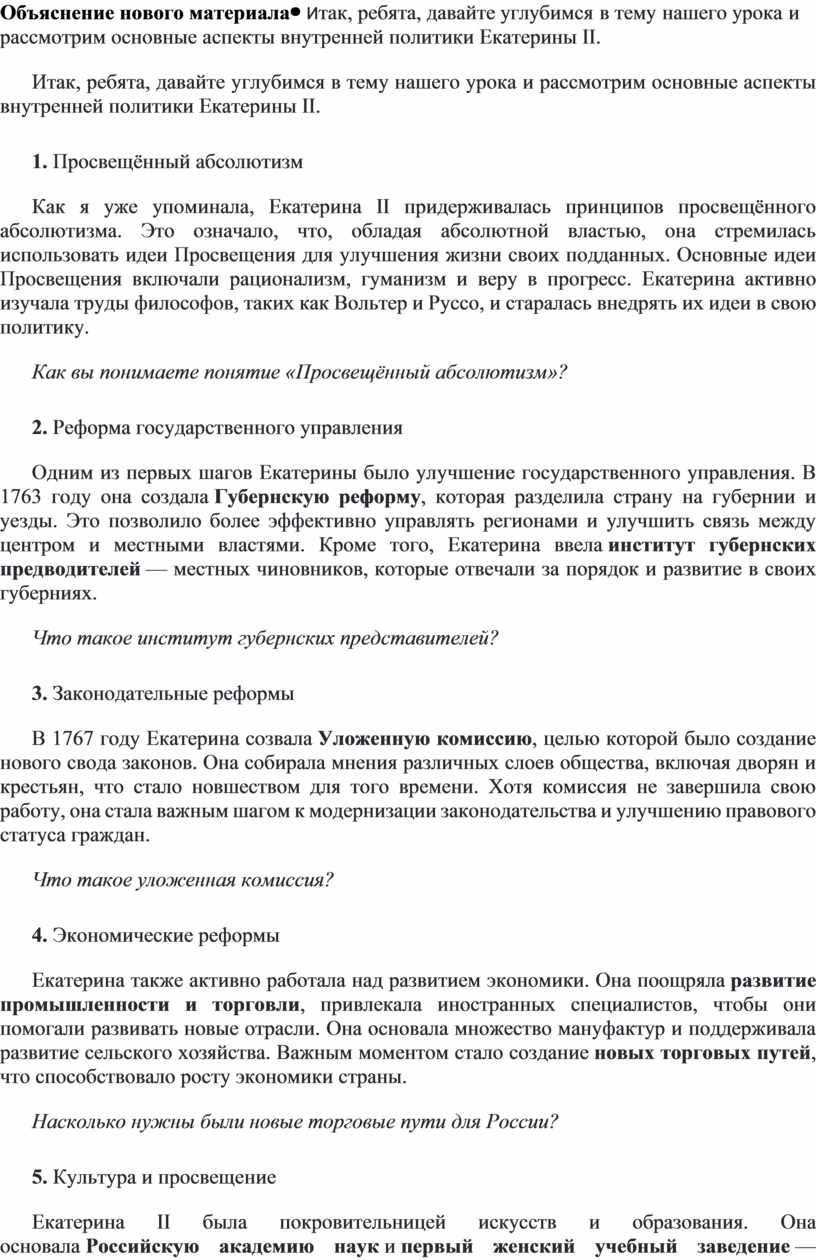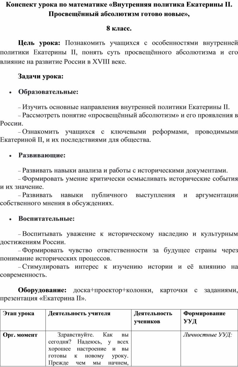 Конспект урока по математике «Внутренняя политика Екатерины II. Просвещённый абсолютизм готово новые»,
