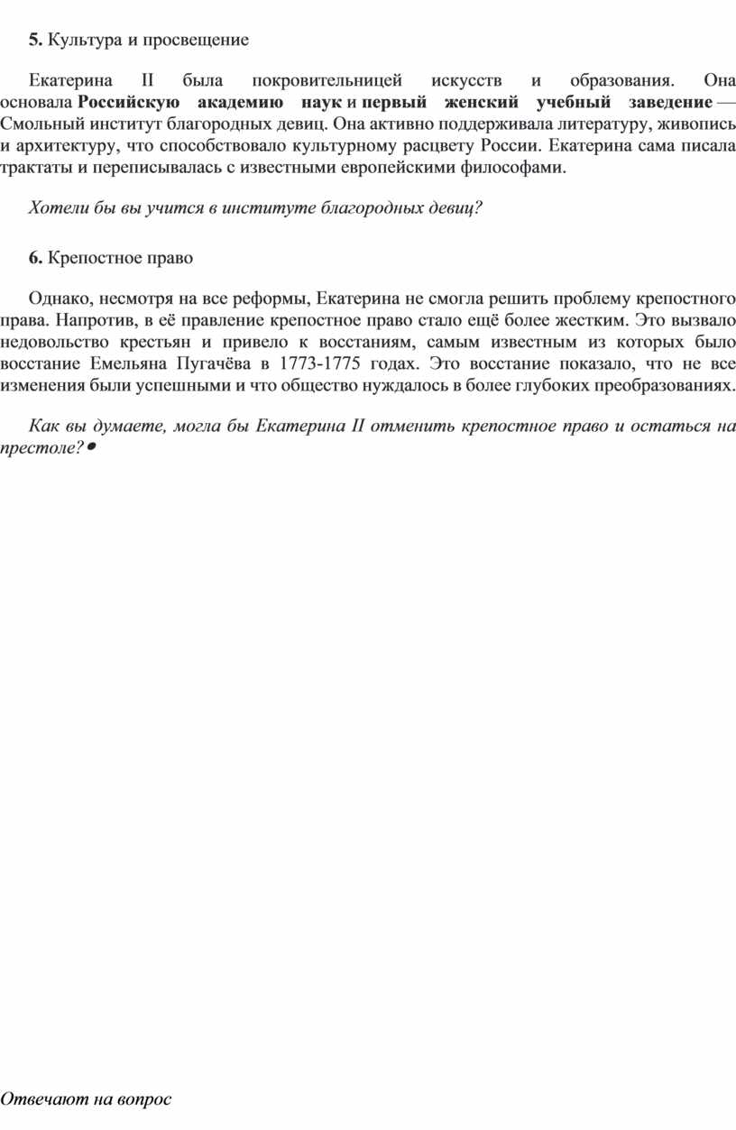 Итак, ребята, давайте углубимся в тему нашего урока и рассмотрим основные аспекты внутренней политики Екатерины II. 1. Просвещённый абсолютизмКак я уже упоминала, Екатерина II придерживалась принципов просвещённого абсолютизма. Это означало, что, обладая абсолютной властью, она стремилась использовать идеи Просвещения для улучшения жизни своих подданных. Основные идеи Просвещения включали рационализм, гуманизм и веру в прогресс. Екатерина активно изучала труды философов, таких как Вольтер и Руссо, и старалась внедрять их идеи в свою политику. Как вы понимаете понятие «Просвещённый абсолютизм»? 2. Реформа государственного управленияОдним из первых шагов Екатерины было улучшение государственного управления. В 1763 году она создала Губернскую реформу, которая разделила страну на губернии и уезды. Это позволило более эффективно управлять регионами и улучшить связь между центром и местными властями. Кроме того, Екатерина ввела институт губернских предводителей — местных чиновников, которые отвечали за порядок и развитие в своих губерниях. Что такое институт губернских представителей? 3. Законодательные реформыВ 1767 году Екатерина созвала Уложенную комиссию, целью которой было создание нового свода законов. Она собирала мнения различных слоев общества, включая дворян и крестьян, что стало новшеством для того времени. Хотя комиссия не завершила свою работу, она стала важным шагом к модернизации законодательства и улучшению правового статуса граждан. Что такое уложенная комиссия? 4. Экономические реформыЕкатерина также активно работала над развитием экономики. Она поощряла развитие промышленности и торговли, привлекала иностранных специалистов, чтобы они помогали развивать новые отрасли. Она основала множество мануфактур и поддерживала развитие сельского хозяйства. Важным моментом стало создание новых торговых путей, что способствовало росту экономики страны. Насколько нужны были новые торговые пути для России? 5. Культура и просвещениеЕкатерина II была покровительницей искусств и образования. Она основала Российскую академию наук и первый женский учебный заведение — Смольный институт благородных девиц. Она активно поддерживала литературу, живопись и архитектуру, что способствовало культурному расцвету России. Екатерина сама писала трактаты и переписывалась с известными европейскими философами. Хотели бы вы учится в институте благородных девиц? 6. Крепостное правоОднако, несмотря на все реформы, Екатерина не смогла решить проблему крепостного права. Напротив, в её правление крепостное право стало ещё более жестким. Это вызвало недовольство крестьян и привело к восстаниям, самым известным из которых было восстание Емельяна Пугачёва в 1773-1775 годах. Это восстание показало, что не все изменения были успешными и что общество нуждалось в более глубоких преобразованиях. Как вы думаете, могла бы Екатерина II отменить крепостное право и остаться на престоле? |