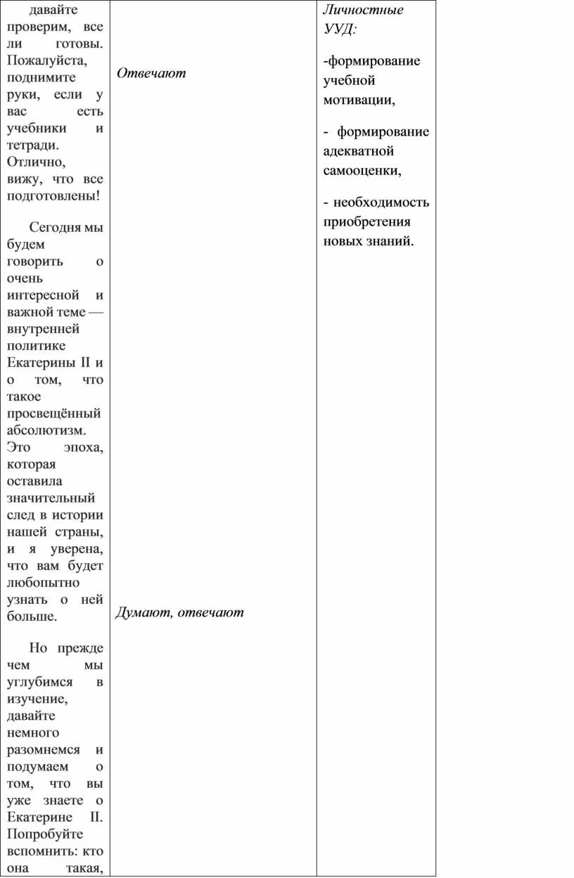 Здравствуйте. Как вы сегодня? Надеюсь, у всех хорошее настроение и вы готовы к новому уроку. Прежде чем мы начнем, давайте проверим, все ли готовы. Пожалуйста, поднимите руки, если у вас есть учебники и тетради. Отлично, вижу, что все подготовлены! Сегодня мы будем говорить о очень интересной и важной теме — внутренней политике Екатерины II и о том, что такое просвещённый абсолютизм. Это эпоха, которая оставила значительный след в истории нашей страны, и я уверена, что вам будет любопытно узнать о ней больше. Но прежде чем мы углубимся в изучение, давайте немного разомнемся и подумаем о том, что вы уже знаете о Екатерине II. Попробуйте вспомнить: кто она такая, какие достижения у неё были, и почему её правление считается важным в истории России. Можете поделиться своими мыслями? (Жду ответов от учеников, поощряю активность и задаю уточняющие вопросы.) Хорошо, спасибо за ваши ответы! Это поможет нам лучше понять тему урока. Давайте перейдем к целям нашего занятия. Мы не только узнаем о реформах Екатерины II, но и научимся анализировать исторические документы и выражать свои мысли. Теперь, если у вас нет вопросов, давайте начнем