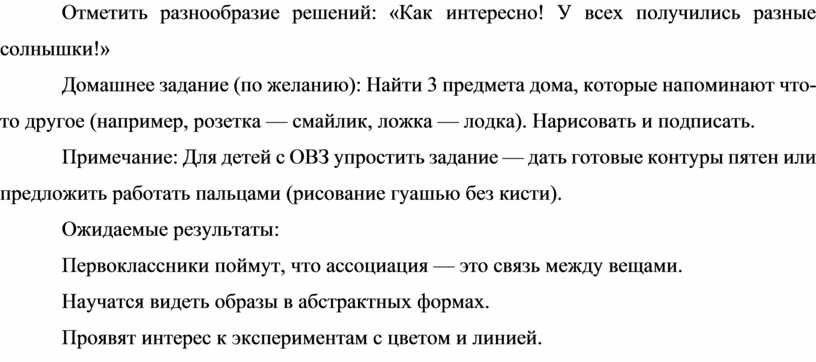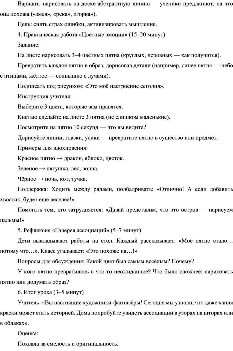 Учитель: «Вы настоящие художники-фантазёры! Сегодня мы узнали, что даже капля краски может стать историей. Дома попробуйте увидеть ассоциации в узорах на шторах или в облаках».