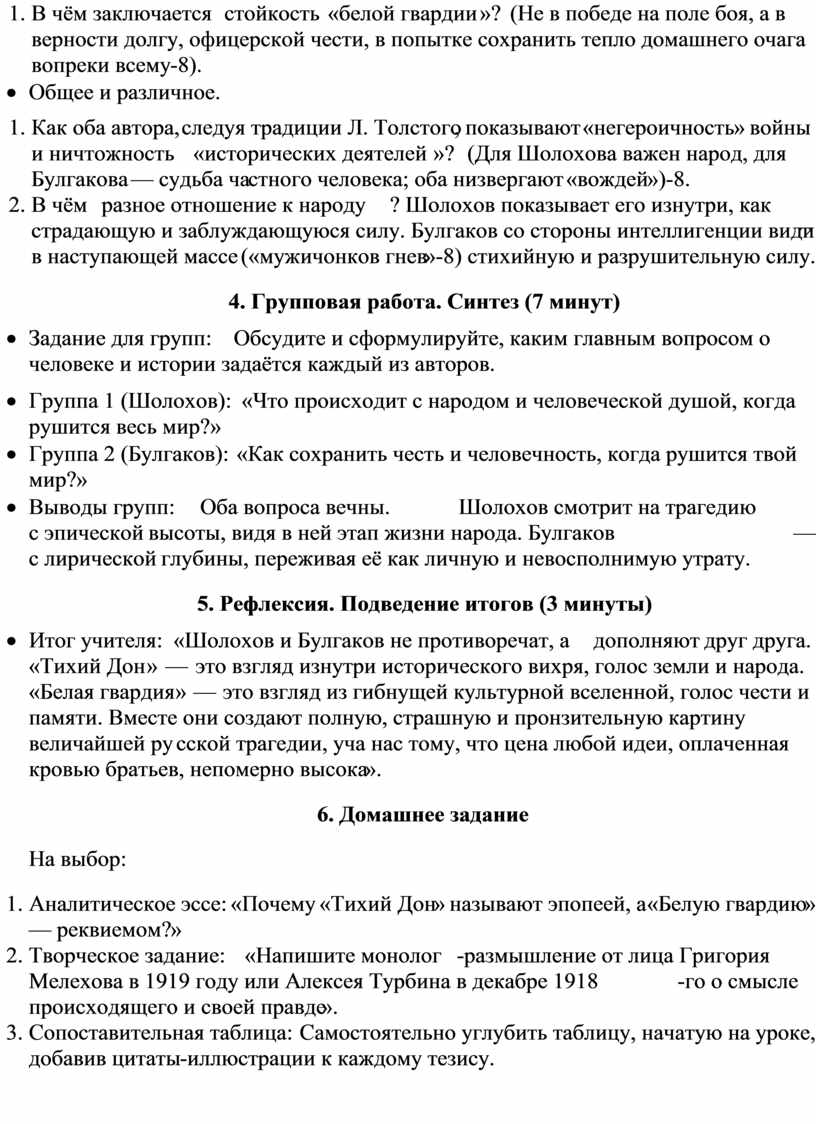 · Итог учителя: «Шолохов и Булгаков не противоречат, а дополняют друг друга. «Тихий Дон» — это взгляд изнутри исторического вихря, голос земли и народа. «Белая гвардия» — это взгляд из гибнущей культурной вселенной, голос чести и памяти. Вместе они создают полную, страшную и пронзительную картину величайшей русской трагедии, уча нас тому, что цена любой идеи, оплаченная кровью братьев, непомерно высока».