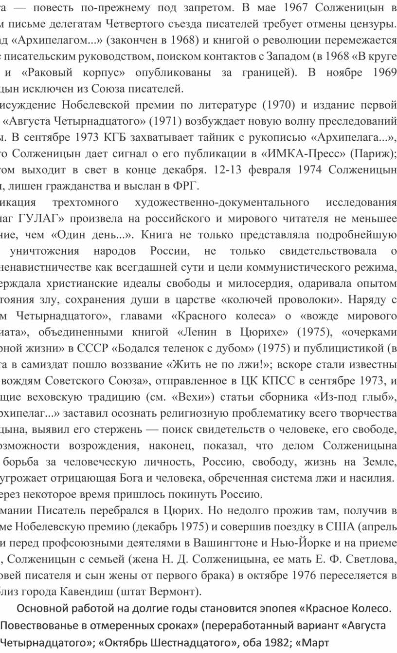 Присуждение Нобелевской премии по литературе (1970) и издание первой редакции «Августа Четырнадцатого» (1971) возбуждает новую волну преследований и клеветы. В сентябре 1973 КГБ захватывает тайник с рукописью «Архипелага...», после чего Солженицын дает сигнал о его публикации в «ИМКА-Пресс» (Париж); первый том выходит в свет в конце декабря. 12-13 февраля 1974 Солженицын арестован, лишен гражданства и выслан в ФРГ.
