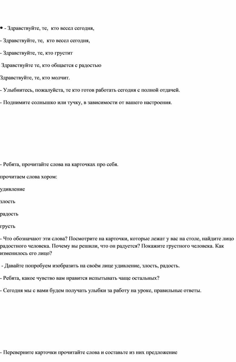 - Ребята, прочитайте слова на карточках про себя. прочитаем слова хором: удивление злость радость грусть - Что обозначают эти слова? Посмотрите на карточки, которые лежат у вас на столе, найдите лицо радостного человека. Почему вы решили, что он радуется? Покажите грустного человека. Как изменилось его лицо? - Давайте попробуем изобразить на своём лице удивление, злость, радость. - Ребята, какое чувство вам нравится испытывать чаще остальных? - Сегодня мы с вами будем получать улыбки за работу на уроке, правильные ответы.