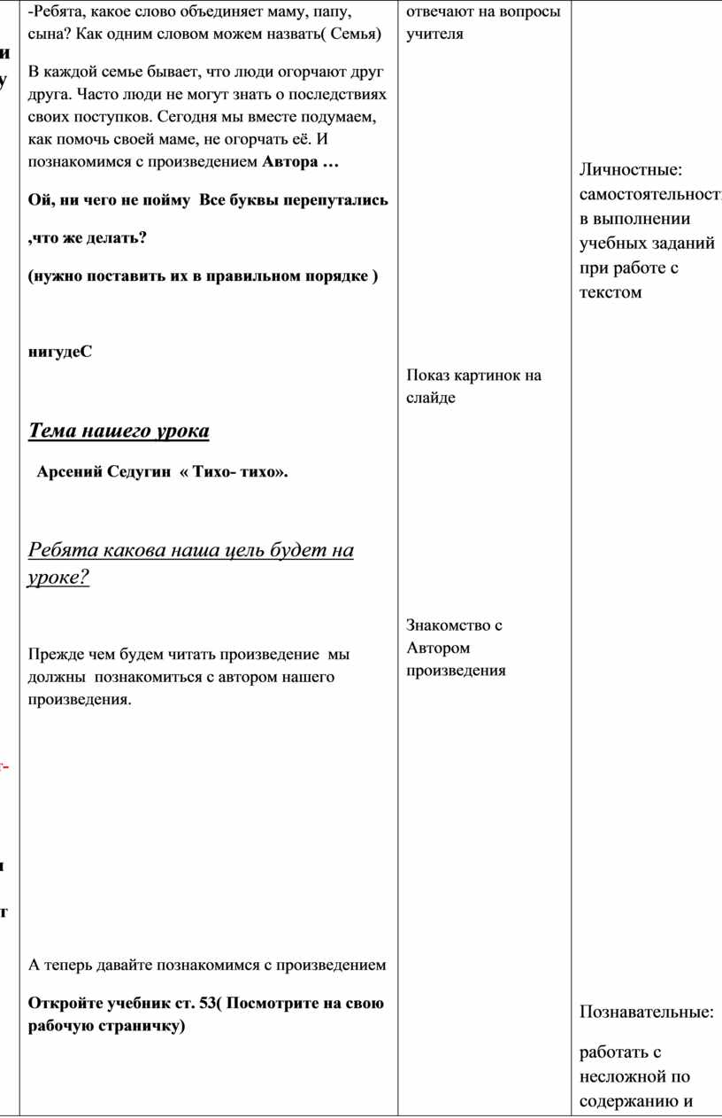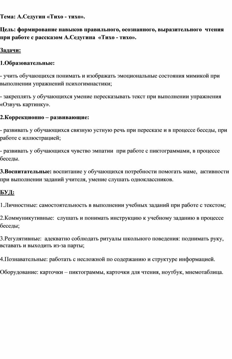 Цель: формирование навыков правильного, осознанного, выразительного чтения при работе с рассказом А.Седугина «Тихо - тихо».