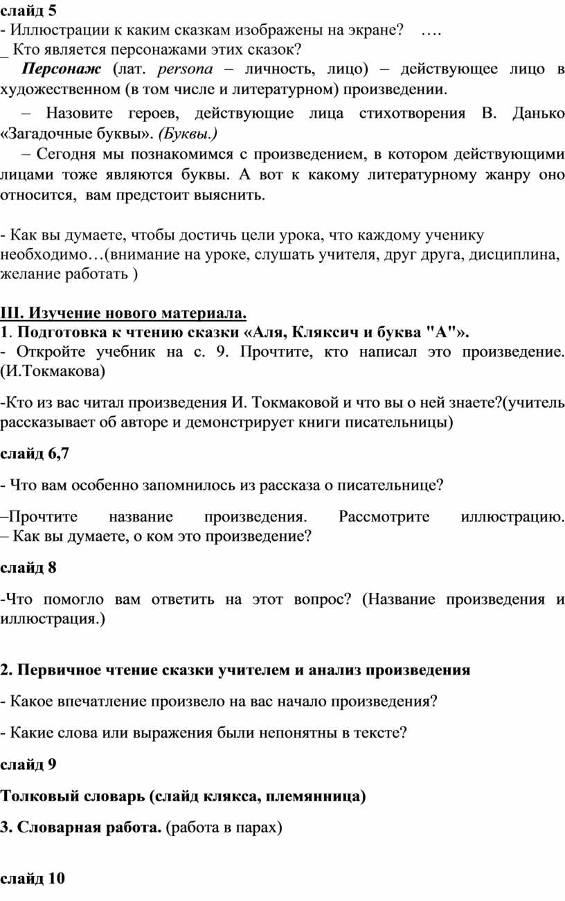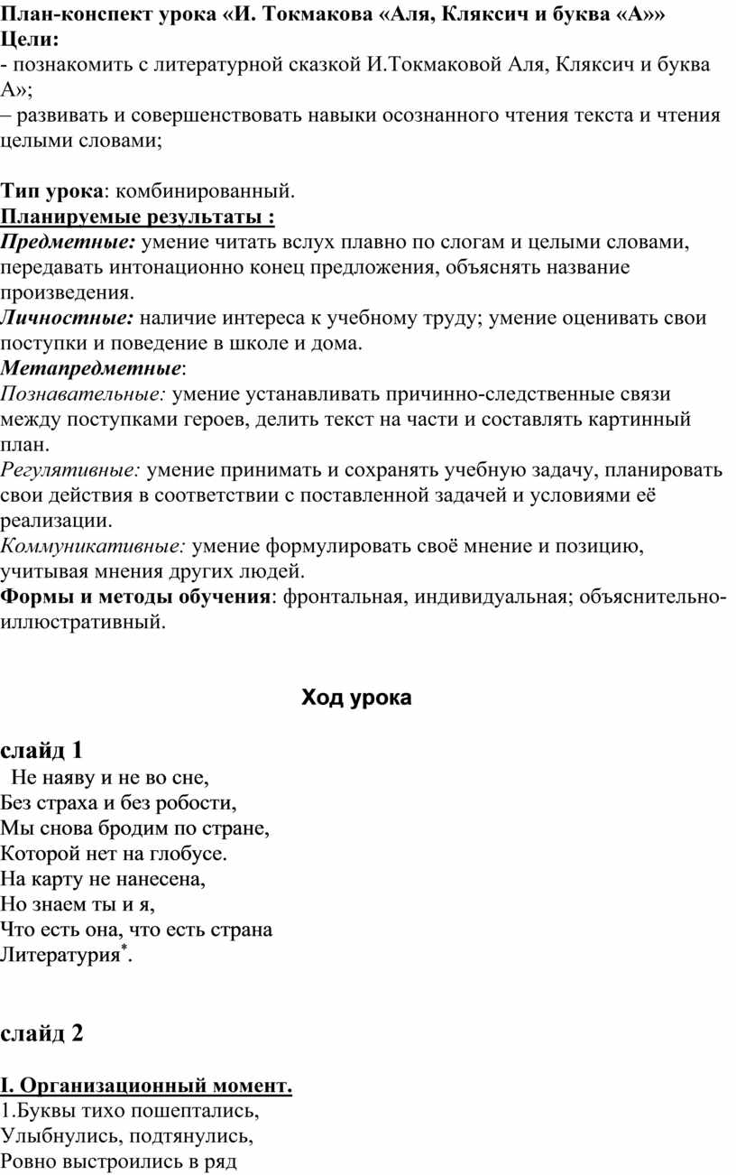 План-конспект урока «И. Токмакова «Аля, Кляксич и буква «А»»