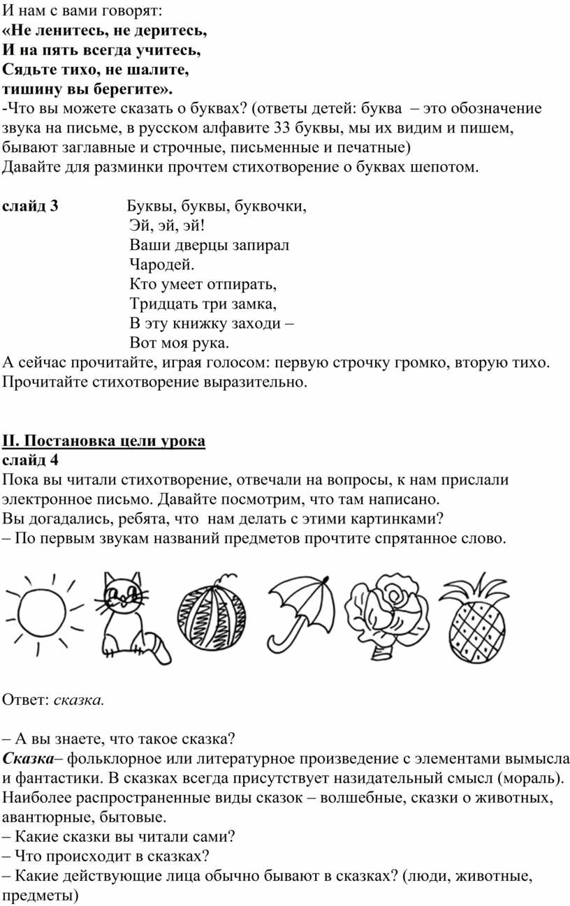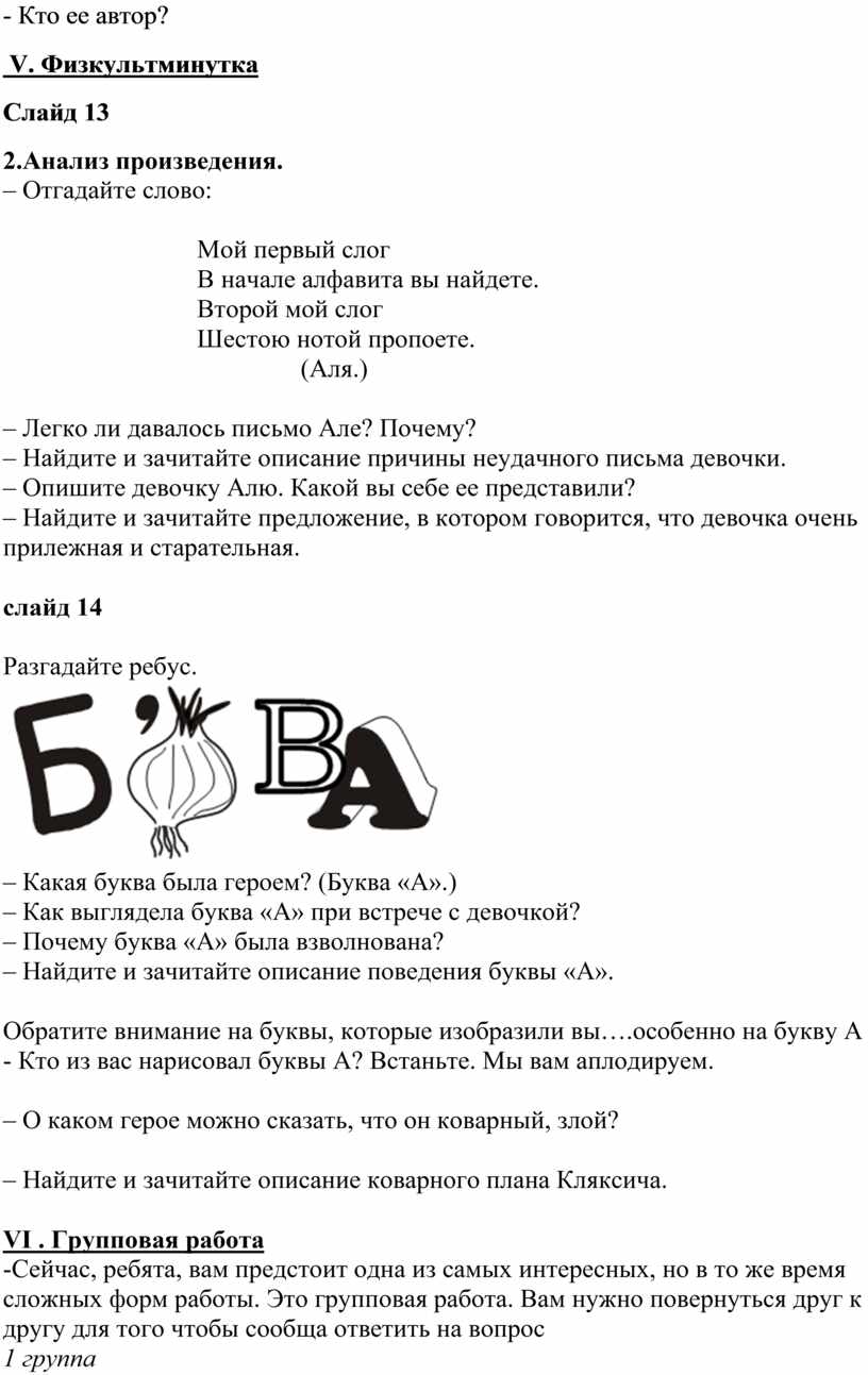 – Сегодня мы познакомимся с произведением, в котором действующими лицами тоже являются буквы. А вот к какому литературному жанру оно относится, вам предстоит выяснить.