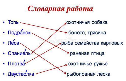 определением значения трудных слов: топь, подранок, леса, спаниель,