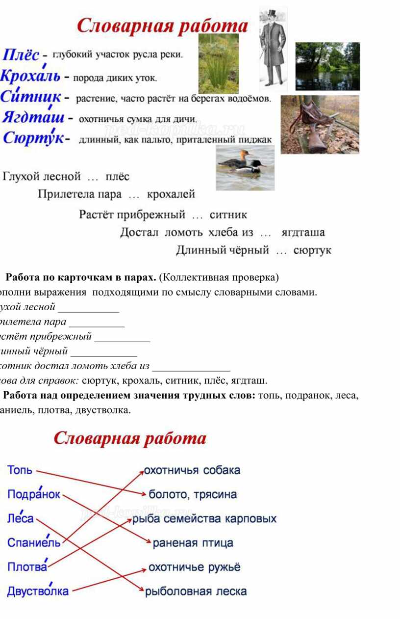 А) Знакомство с трудными словами и их значением: плёс, крохаль, ситник, ягдташ, сюртук.