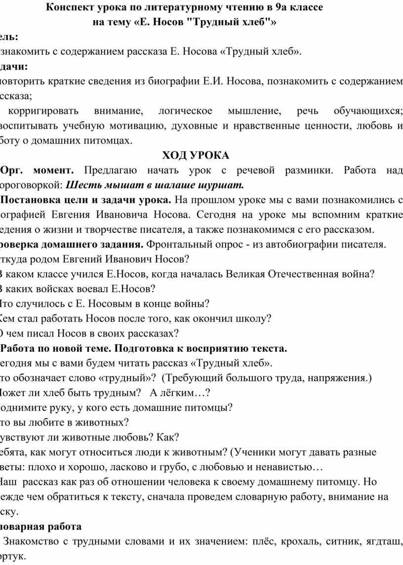 познакомить с содержанием рассказа Е. Носова «Трудный хлеб».